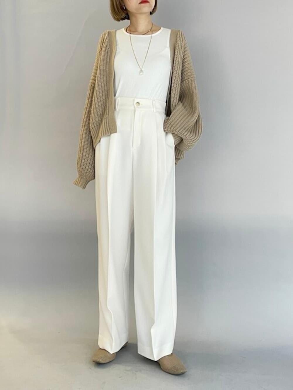 ホワイトとベージュのずるっとクリーミーコーデ♪ サロペットにも普通のスラックスパンツとしても使える美シルエットパンツ♡ 暗くなりがちな秋冬コーデにかなり使えるホワイトパンツは一本は持っておきたい!!! 他にもトレンドアイテムやこれから使えるアイテム等幅広いテイストをご用意しておりますので、是非覗いてみてくださいね(*^^*)