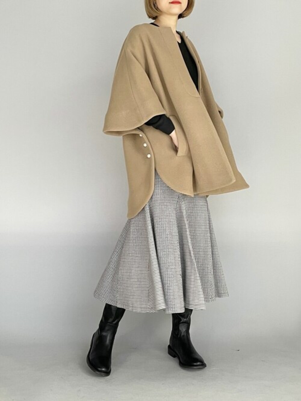 上品に大人クラシカルコーデ♪ Aラインのポンチョコートと千鳥柄の配色が可愛いマーメイドスカートで ヒラっとしたシルエットに◎♡♡ インナーと足元はブラックでキュッと締めて甘々になり過ぎないようにしてみました♪ 他にもトレンドアイテムやこれから使えるアイテム等幅広いテイストをご用意しておりますので、是非覗いてみてくださいね(*^^*)