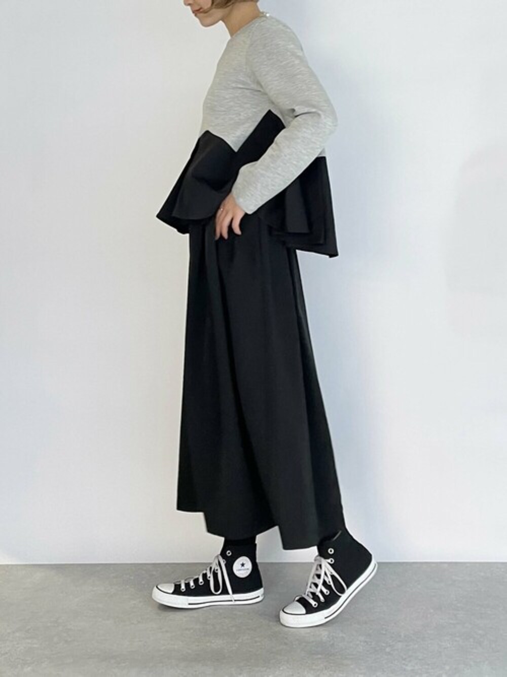 アシンメトリーなペプラムデザインが可愛いプルオーバー♪ 上はダンボールニットのモチっと質感で裾には張り感のある布帛生地がドッキングされ、 布帛部分が割と高めの位置からあるのでスタイルよく見えて、 プラスお腹周りをカバーしてくれます♡♡ 左肩部分にさり気なくパールボタンが付いているからキレイめスタイルにも活躍してくれるアイテムです!! 今回は、モノトーンカジュアルスタイルでアクティブなスタイルに♪ 他にもトレンドアイテムやこれから使えるアイテム等幅広いテイストをご用意しておりますので、是非覗いてみてくださいね(*^^*)