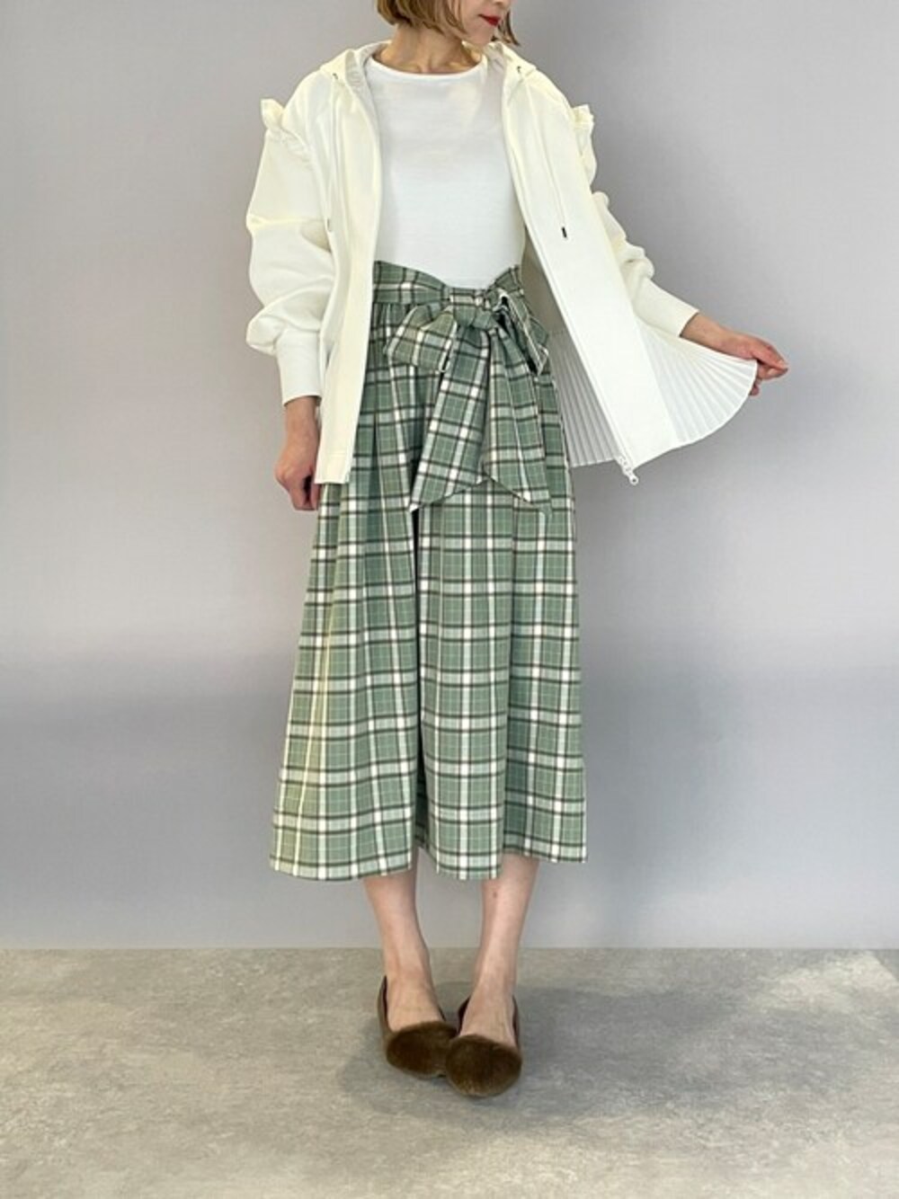 フェミニンなチェック切替えワンピースコーデ♪ ホワイト×柔らかグリーンチェックの配色が春らしい一着です! ウエストリボンは前後それぞれで結ぶのも◎ 今回は、アウター合わせだから斜め前結びに♪♪ 上見頃がタイトめだからカーディガン等のコンパクトなアイテムを上に合わせるのも良さそうです(^^) 他にもトレンドアイテムやこれから使えるアイテム等幅広いテイストをご用意しておりますので、是非覗いてみてくださいね(*^^*)