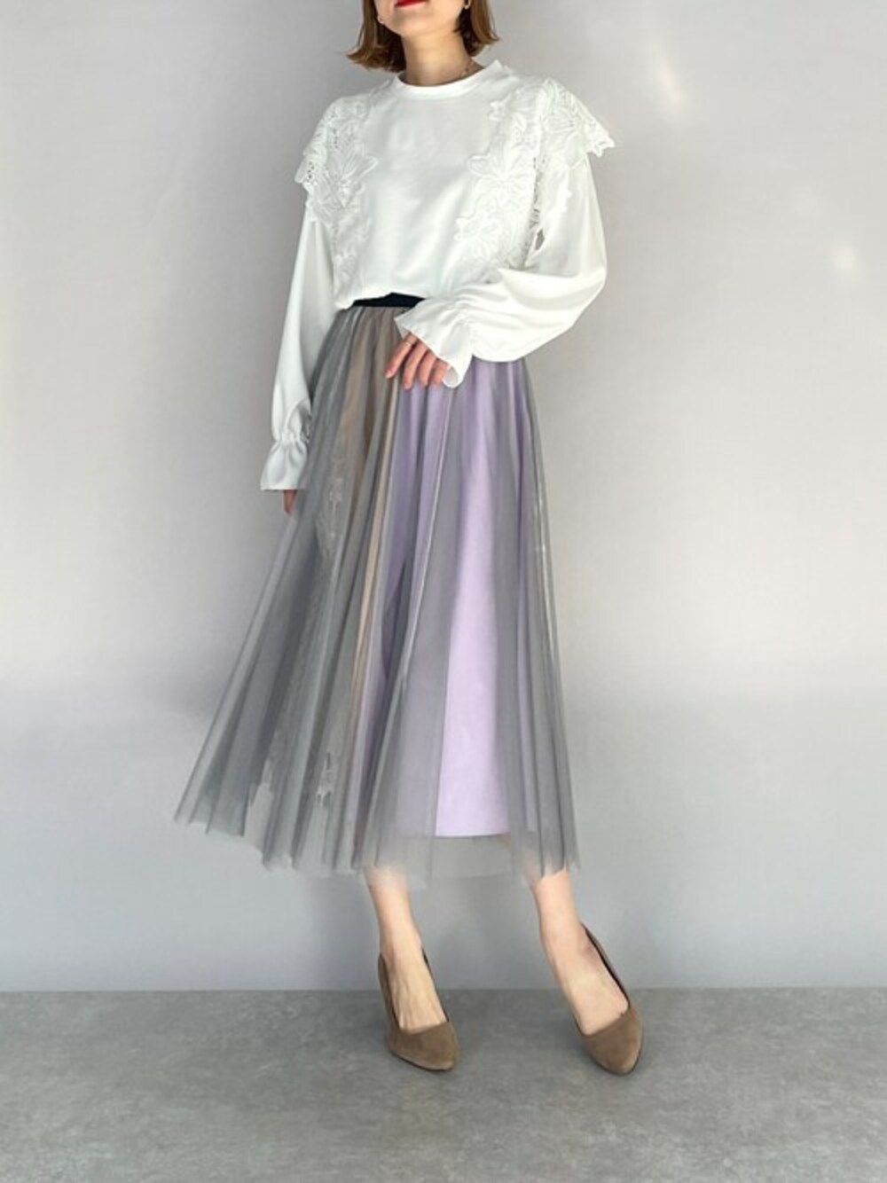 エレガントなフラワーレースプルオーバーコーデ♪ 身頃はカット生地に袖はサラっとした異素材生地になっていて、キレイめだけじゃなくカジュアルにも◎ プラス、立体感のあるレースや袖のキャンディースリーブがきちんと女性らしく見せてくれるのも嬉しいポイント! 今回は、配色カラー&チュールのスカートでエレガントに(^^)♪ 他にもトレンドアイテムやこれから使えるアイテム等幅広いテイストをご用意しておりますので、是非覗いてみてくださいね(*^^*)