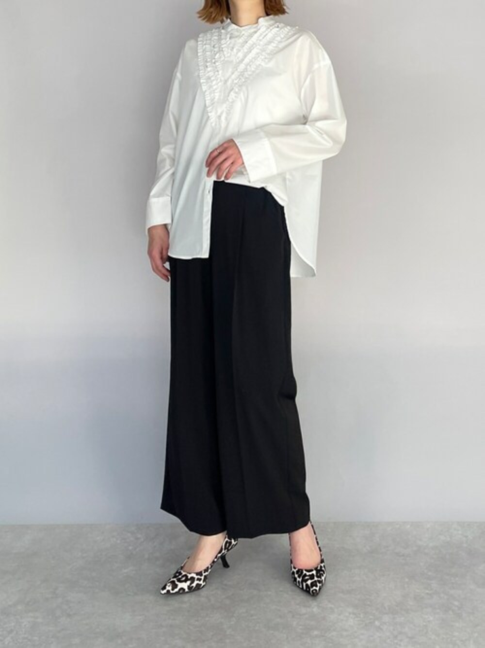 ホワイト×ブラックのモノトーンコーデ♪ フロントフリルがポイントのブラウスは、 可愛さもありながら、袖がストレートデザインになっているから、 合わせ方次第でシックなスタイルにも◎ 今回は、ブラックパンツにレオパードパンプスでアクセントをプラス(^^) 他にもトレンドアイテムやこれから使えるアイテム等幅広いテイストをご用意しておりますので、是非覗いてみてくださいね(*^^*)