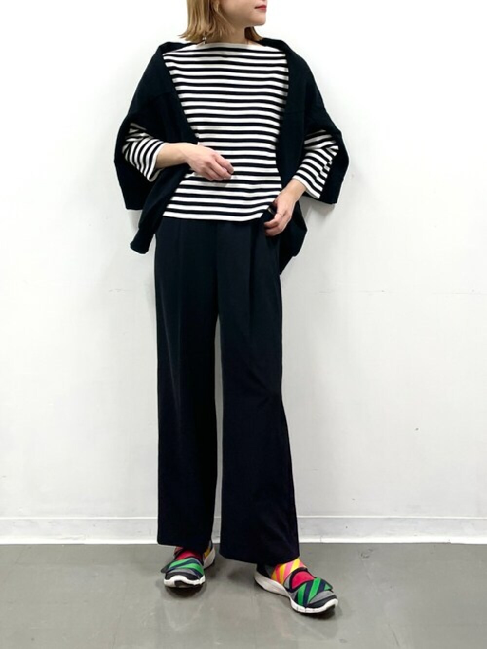 ボーダーのモノトーンコーデ♪ ボートネックのボーダーニットは身幅もゆったりしていて、 今っぽいゆったりとしたシルエット+長過ぎず短過ぎずの着丈でバランスが取りやすいです!! センタープレスが入った美シルエットパンツにカラフリーな足元でスポーティーなモノトーンスタイルに(^^) 他にもトレンドアイテムやこれから使えるアイテム等幅広いテイストをご用意しておりますので、是非覗いてみてくださいね(*^^*)