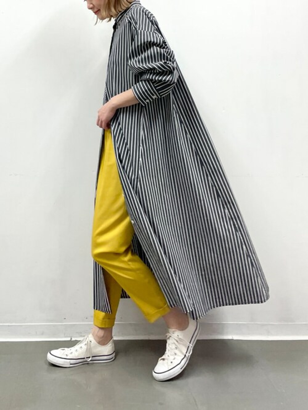 ストライプ×イエローコーデ♪ 今の時期から使えるストライプワンピースは、 裾にかけて広がりのあるラインで、 体型カバーもしっかりしてくれる優れものです! 今回は、ウエスト下のボタンを開けて、パンツのチラ見せスタイルに(^^) 前を開けると足捌きも楽々に♪ 他にもトレンドアイテムやこれから使えるアイテム等幅広いテイストをご用意しておりますので、是非覗いてみてくださいね(*^^*)