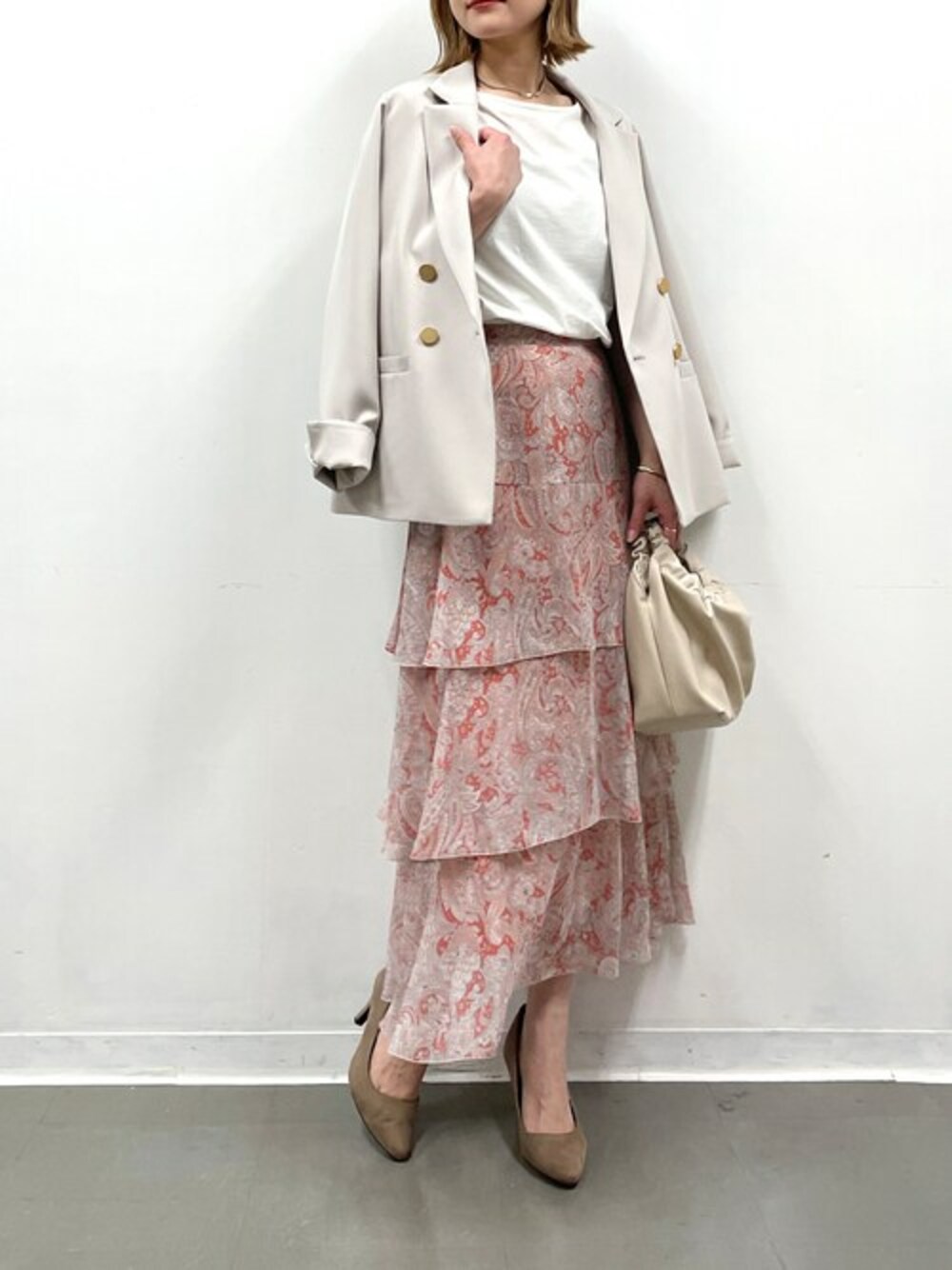 ヒラヒラ揺れるシルエットが可愛いティアードスカートコーデ♪ ストンとしたオチ感があるティアードシルエットに ペイズリー柄だから甘々にならずに大人キレイめスタイルにもマッチ◎ ジャケットにヒールで品見え意識してみました(^^) 夏にはTシャツやノースリにサンダルでラフなスタイルもしてみたいです♪ 他にもトレンドアイテムやこれから使えるアイテム等幅広いテイストをご用意しておりますので、是非覗いてみてくださいね(*^^*)