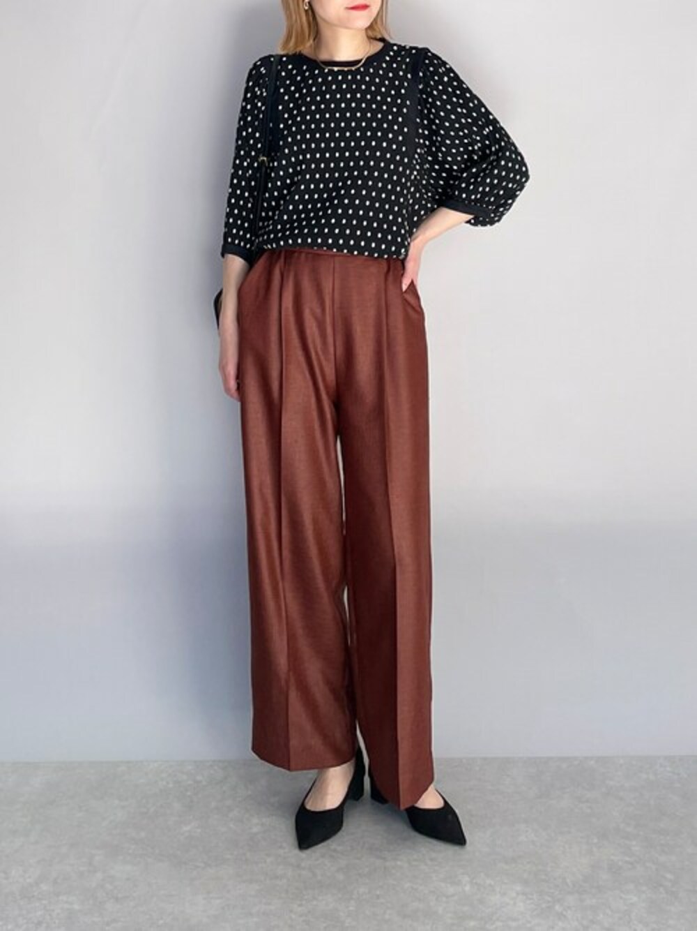 ドットブラウスのキレイめコーデ♪ オチ感があるドットブラウスは、 ドルマンのようなゆったりスリーブで可愛いだけじゃなく楽な着心地が◎です! ほんのり光沢感のあるブラウンのリネンパンツにヒールでキレイめに風に(^^) 他にもトレンドアイテムやこれから使えるアイテム等幅広いテイストをご用意しておりますので、是非覗いてみてくださいね(*^^*)