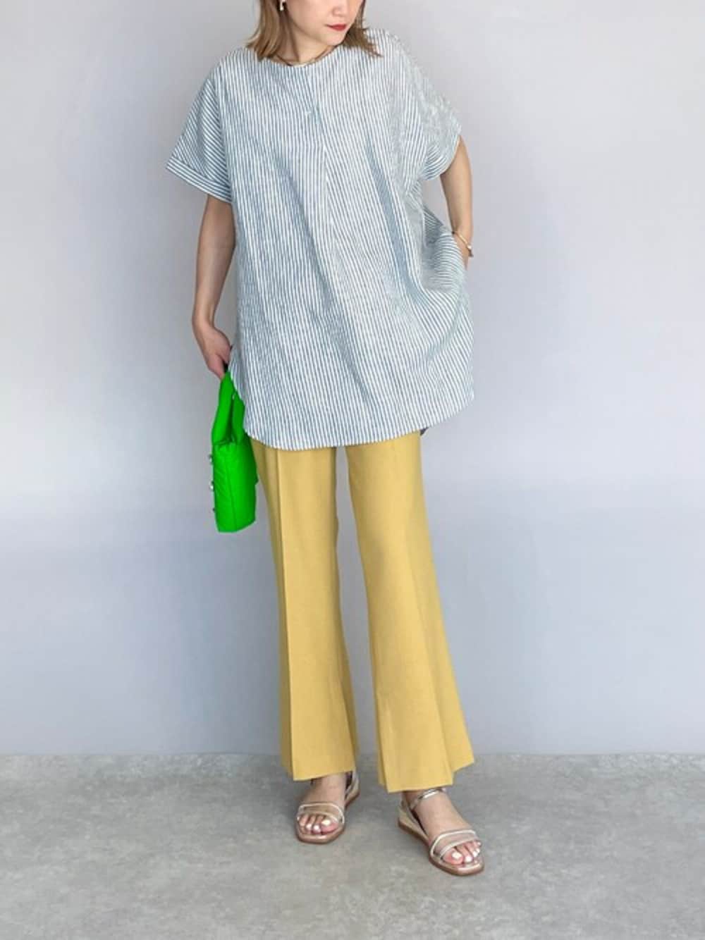 スラっと美シルエットなセミワイドのパンツは、 裾内側のスリットがさり気ないポイントで、 すっきりとした印象をプラス。 柔らかなイエローカラーはコーデにも合わせやすくて、 お洒落感もちゃんと出してくれるからお気に入りの1着です♪ 今回はフレンチリネンのストライプチュニックで、夏らしいカラーコーデに(^^) 他にもトレンドアイテムやこれから使えるアイテム等幅広いテイストをご用意しておりますので、是非覗いてみてくださいね(*^^*)