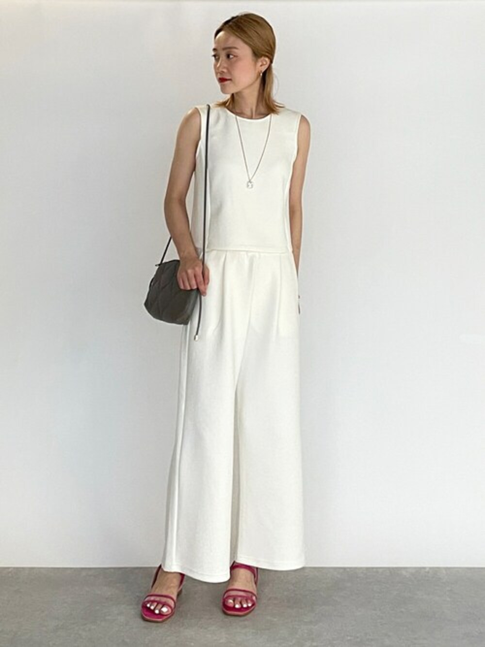 ●トップス ダンボールニットのノースリーブは、 もっちりとした質感で肌触りのいい1枚です。 コンパクトなサイズと着丈でハイウエストのボトムとの相性もいいし、 スタイルも良く見せてくれそうです♪ 襟パールが外せるのも嬉しいポイント。 今回は、パールなしでカジュアルめに♪ ●パンツ 同素材のパンツは、ウエストゴム仕様で こちらも履き心地抜群の1着です! 他にもトレンドアイテムやこれから使えるアイテム等幅広いテイストをご用意しておりますので、是非覗いてみてくださいね(*^^*)