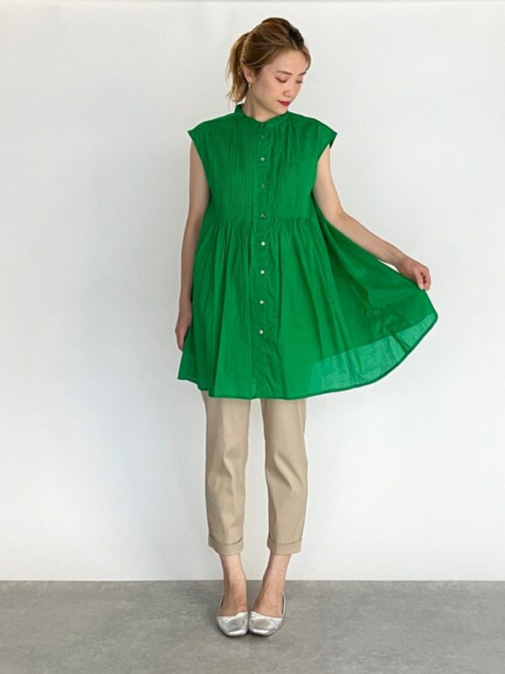 ●ブラウス お尻がすっぽり隠れる着丈のブラウスで、 フワッとしたシルエットになっているので 気になる部分もしっかりカバーしてくれます。 鮮やかなグリーンが夏らしくシンプルな合わせでも華やぎます♪ ●パンツ 定番のウエストギャザーパンツは、 シンプルデザインで合わせやすいので幅広いテイストに活躍中です。 他にもトレンドアイテムやこれから使えるアイテム等幅広いテイストをご用意しておりますので、是非覗いてみてくださいね(*^^*)