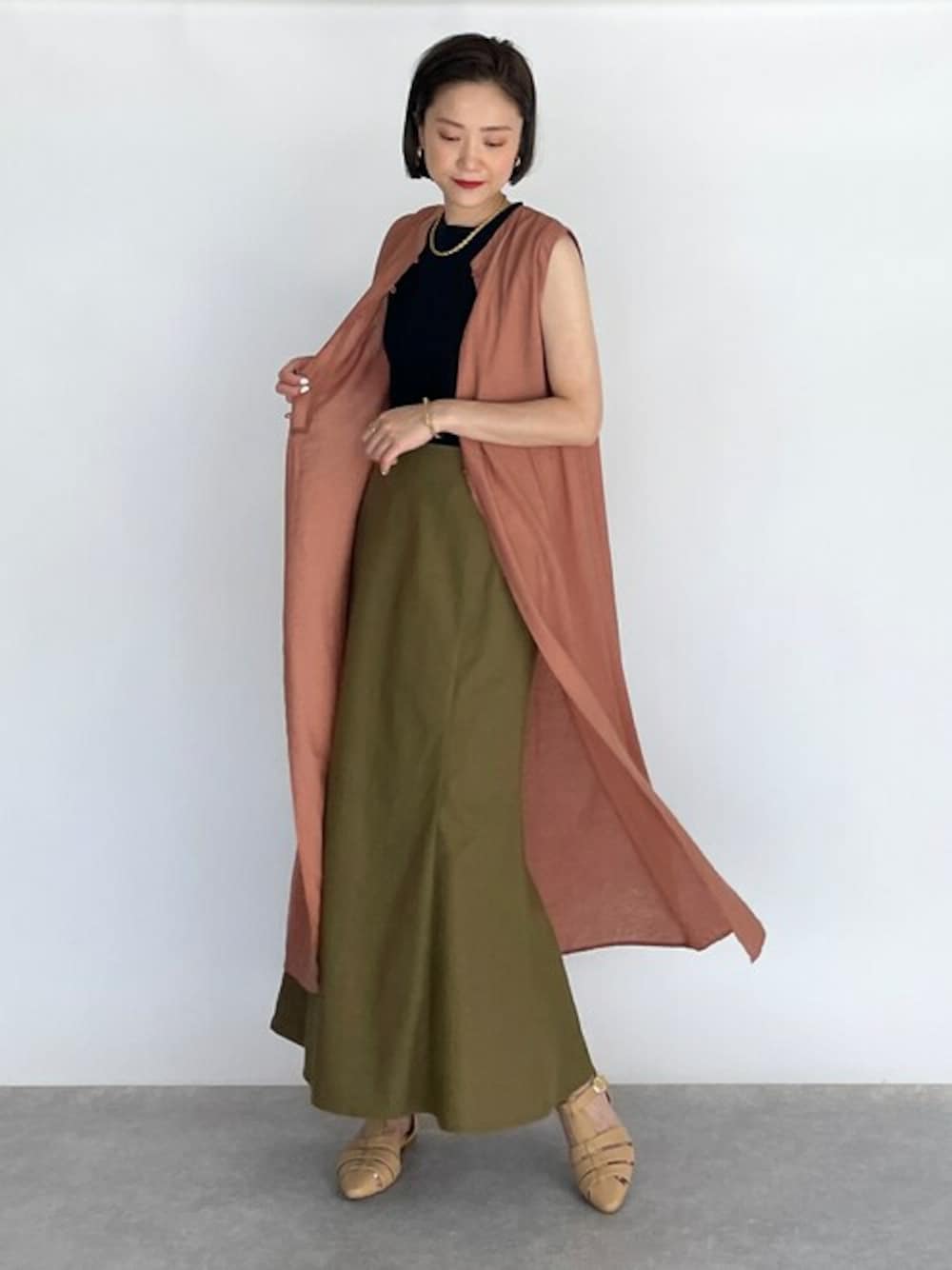 ●ワンピース 前回ご紹介したワンピースを今回は羽織りに♪ 前後2WAYで色んな着回しが出来るのは嬉しいポイント! 秋口には薄手のシアートップスなどと合わせても良さそうです♪ ●トップス 今回は着回し力抜群なノースリーブニットのブラックをチョイス! 万能カラーのブラックは1枚あると助かります♪ ●スカート リネン混のマーメイドスカートは、 シンプルなのにトレンドライクなスタイルが叶う お気に入りの一品です♪ 他にもトレンドアイテムやこれから使えるアイテム等幅広いテイストをご用意しておりますので、是非覗いてみてくださいね(*^^*)