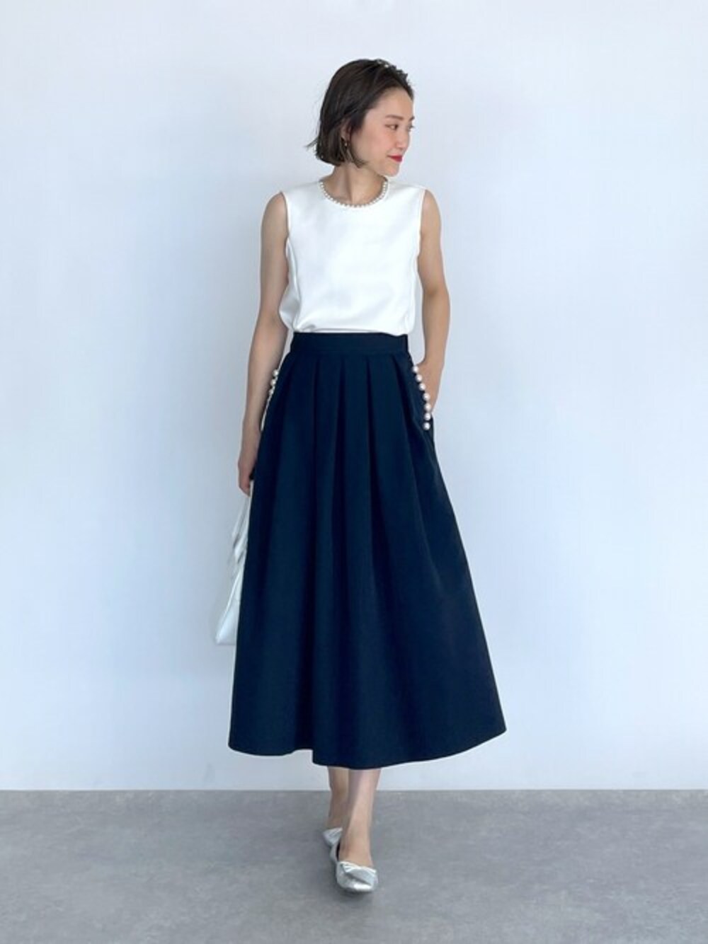 ●トップス ダンボールニットならではの伸縮性が気持ち良く着心地◎ 取り外し可能な襟パール付きで、アクセサリーなしでも華やかに見せてくれるのも嬉しいポイントです! ●スカート ネイビーカラーは、柔らかな印象や女性らしさが出るので重宝してます。 他にもトレンドアイテムやこれから使えるアイテム等幅広いテイストをご用意しておりますので、是非覗いてみてくださいね(*^^*)