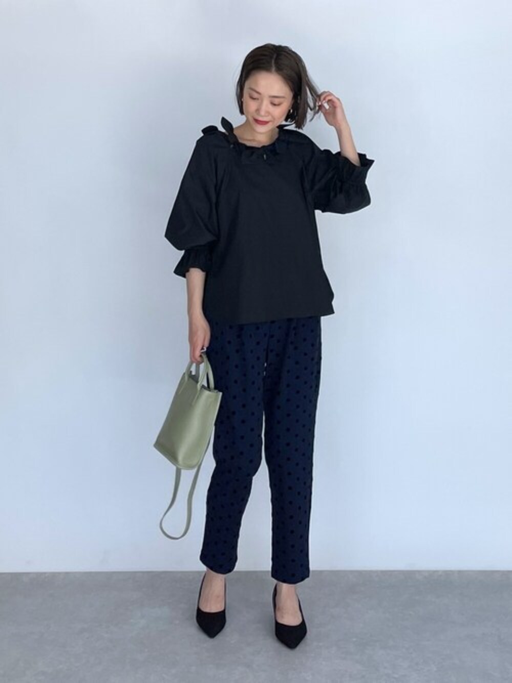 ●ブラウス 襟にたっぷりとリボンが付いたブラウスは、 立体感と存在感があってなんとも可愛い1枚です♪ ブラックだから甘過ぎる事なく着れるのもポイントです! ●パンツ 人気のドットパンツも大人スタイルに丁度いい可愛いらしさがあって活躍中です! 他にもトレンドアイテムやこれから使えるアイテム等幅広いテイストをご用意しておりますので、是非覗いてみてくださいね(*^^*)