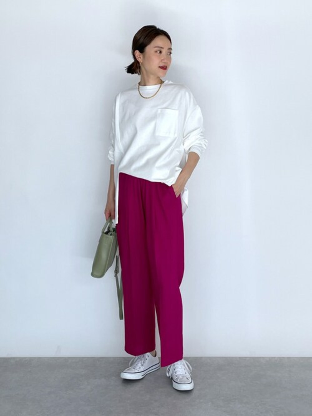 ●カットソー オーバーサイズのカットソーは、 裾のスリットや袖が袖口にかけて細めになったデザインとシンプルながらも、 デザイン性のある1枚です! さらっとそのまま着ても良いですし、 フロントインしたり、袖ロールアップしたりと動きのある感じの着方にも◎ ●パンツ 鮮やかピンクパンツはシンプルコーデに最適な優秀アイテムです♪ 一気に今年らしいスタイルが叶うので、重宝しています。 他にもトレンドアイテムやこれから使えるアイテム等幅広いテイストをご用意しておりますので、是非覗いてみてくださいね(*^^*)