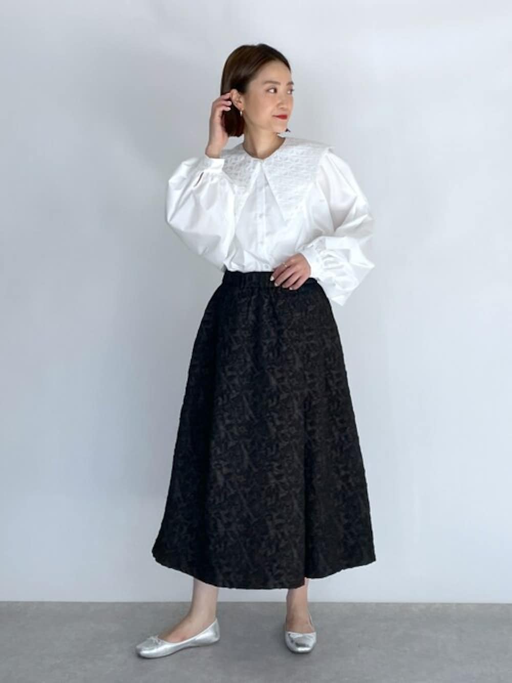 ●ブラウス ビッグカラーの付け襟と袖のボリュームが可愛くてフル活用中のブラウスは、まだまだこれからの季節にも活躍してくれます!! フェミニンにもカジュアルにも合わせやすく、 スカート、パンツ、サロペットとボトムも幅広く合わせれるのが◎◎ 襟も取り外しが出来るので、コーデに合わせて違った雰囲気で楽しめるのも魅力ポイントです♪ ●スカート ポコポコと立体的なジャガードにふんわりシルエットがポイントのスカートは、 女性らしいスタイルにぴったりのアイテムです。 ほんのり光沢があるので、品良く見える大人可愛いスカートです! 他にもトレンドアイテムやこれから使えるアイテム等幅広いテイストをご用意しておりますので、是非覗いてみてくださいね(*^^*)