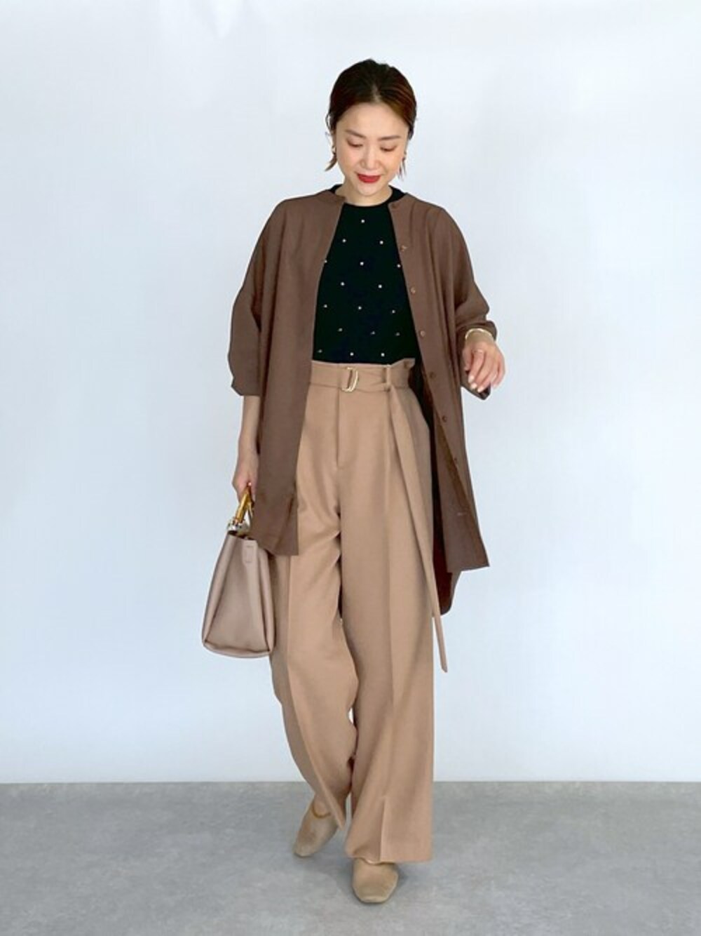 ●シャツ ノーカラーのゆったりシャツを今回はさらっと羽織りで着てみました! 袖口がリブになっているから、プッシュアップも楽々に♪ シンプルデザインですが後ろにギャザーがあるので、ちゃんとメリハリのあるコーデに見せてくれます! ●ニット 今の時期に嬉しいサラッとした肌触りの五分袖のリブニットです! 主張し過ぎないドット柄なので、 カラー物との相性もいいですし、メイントップスだけじゃなくてインナートップスとしてもかなり重宝しています! ●パンツ ワイドなのにシルエットが綺麗なパンツです! 付属ベルトのゴールドがいいアクセントになり上品に見せてくれます。 カッコ良くも着れるので、この秋冬活躍間違いなしです! 他にもトレンドアイテムやこれから使えるアイテム等幅広いテイストをご用意しておりますので、是非覗いてみてくださいね(*^^*)