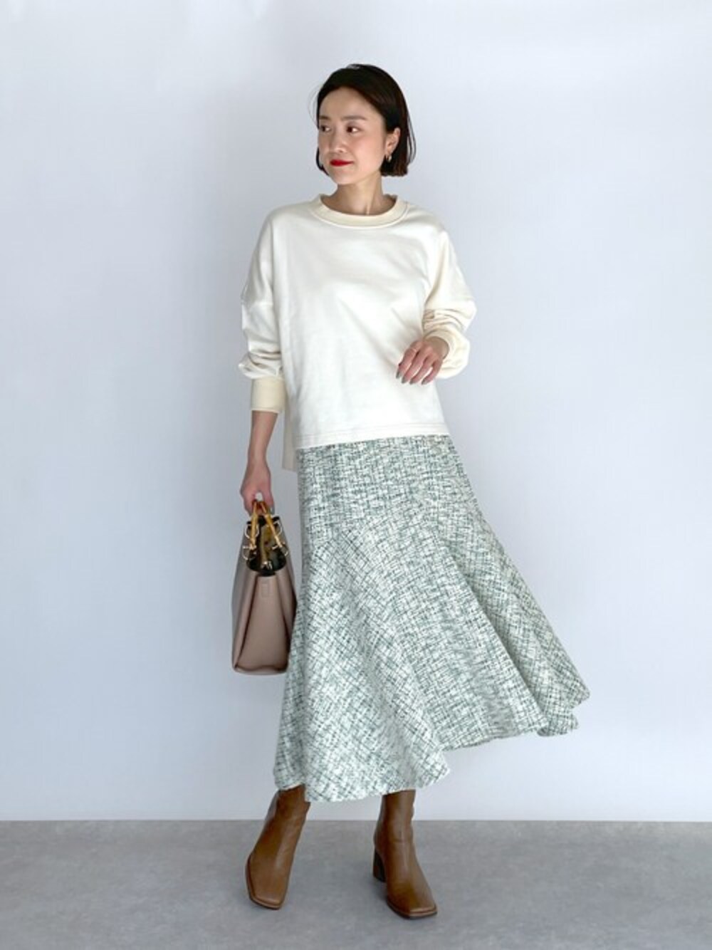 ●プルオーバー ゆったりした身幅と袖幅で楽な着心地です。 今年らしいショート丈ですが、短過ぎないのでボトムともバランスが取りやすく、バックのラインテープがいいアクセントになってくれのでお気に入りです♪ ●スカート 前から後ろにかけて長めになったマーメイドスカートで、動くたびに揺れる感じが◎◎ カットツイード生地なので楽なのに綺麗見えしてくれます! 他にもトレンドアイテムやこれから使えるアイテム等幅広いテイストをご用意しておりますので、是非覗いてみてくださいね(*^^*)
