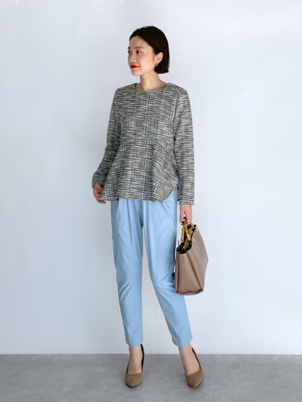 ●トップス ツイード柄で綺麗に上品に見せてくれます。 ペプラムデザインだから気になるウエスト周りもカバーしてくれるので◎ ●パンツ 程よくゆとりがあって伸縮性もあるので、 楽に履けます。 柔らかいカラーなので秋冬には丁度良く差し色になってくれます♪ 他にもトレンドアイテムやこれから使えるアイテム等幅広いテイストをご用意しておりますので、是非覗いてみてくださいね(*^^*)