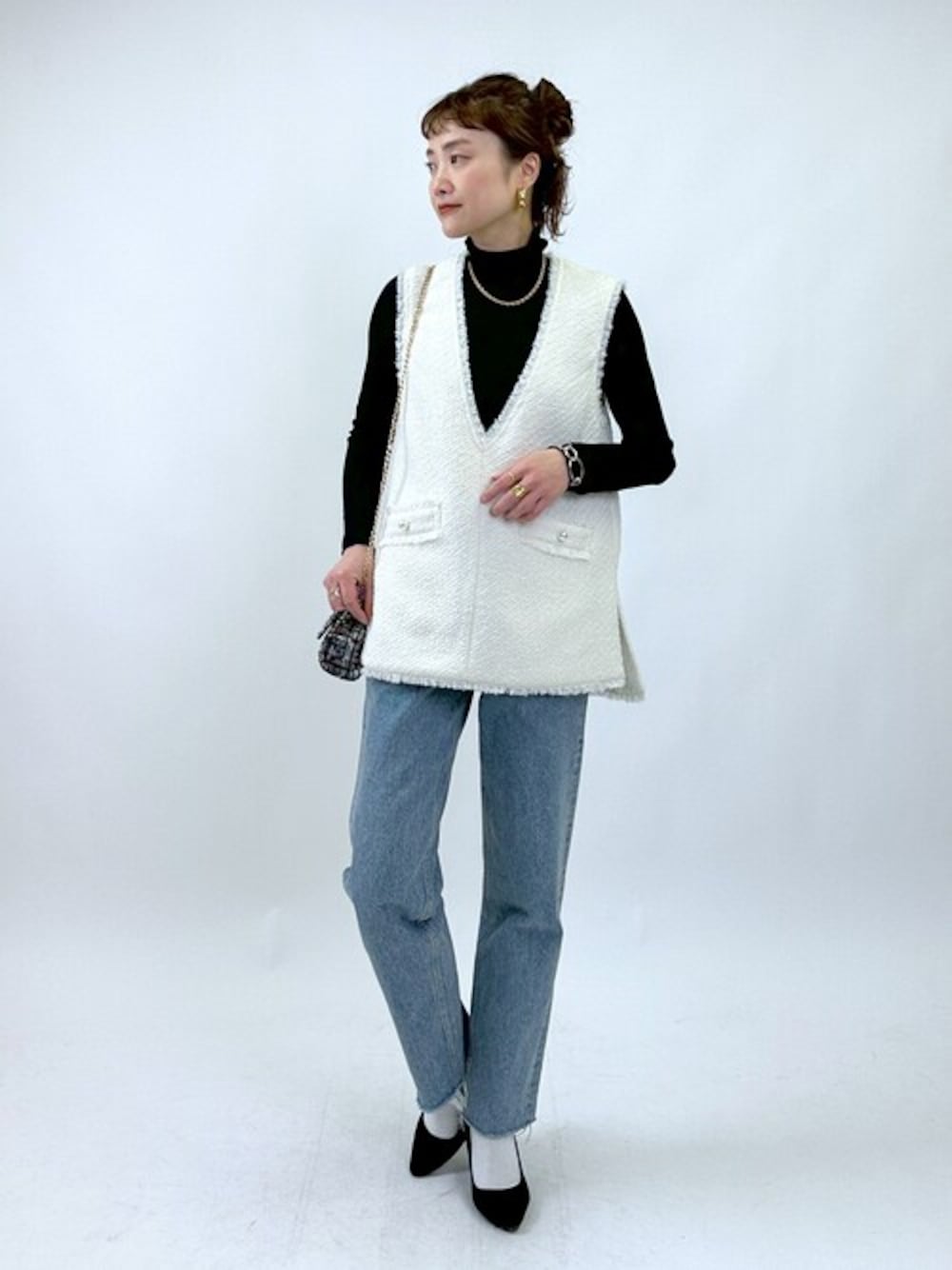 PICCIN PRESS(PICCIN)のベスト「ウール混 フリンジ ツイードVネックベスト」を使ったコーディネート