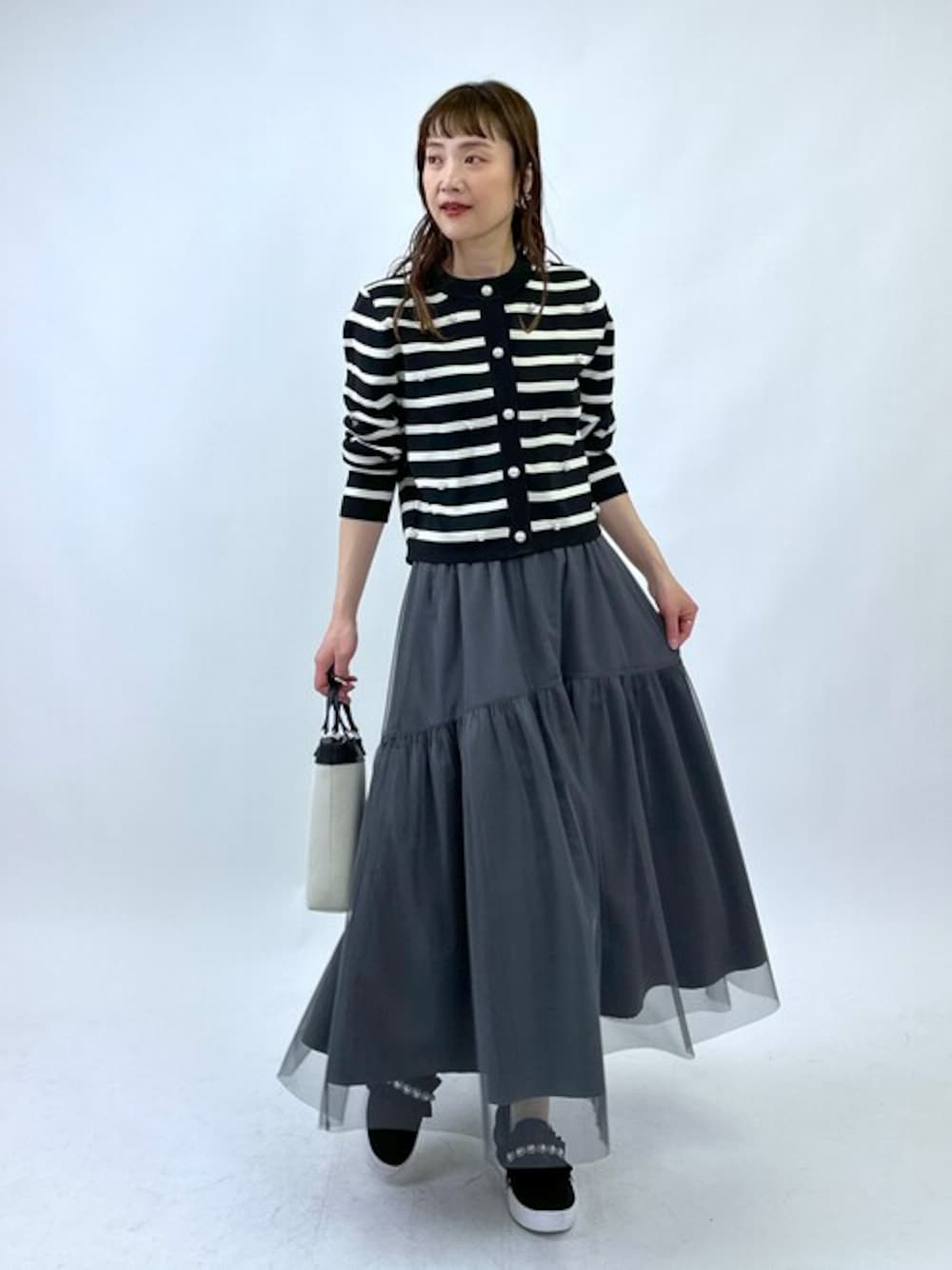●カーディガン ボーダー×パールでカジュアルなのに華やかさもあるカーディガンです。 長すぎず短すぎずの絶妙な着丈なので、色んなボトムとも合わせやすいです。 春には1枚で、今の時期にはリブニット、タートル等を入れて着るのも◎ ●スカート ふんわりチュールが可愛いスカートは、コーデに取り入れるだけで春らしい軽やかさが出ます。 落ち着いたグレーは甘すぎないので、キレイめにもシックなスタイリングにも合わせやすいです。