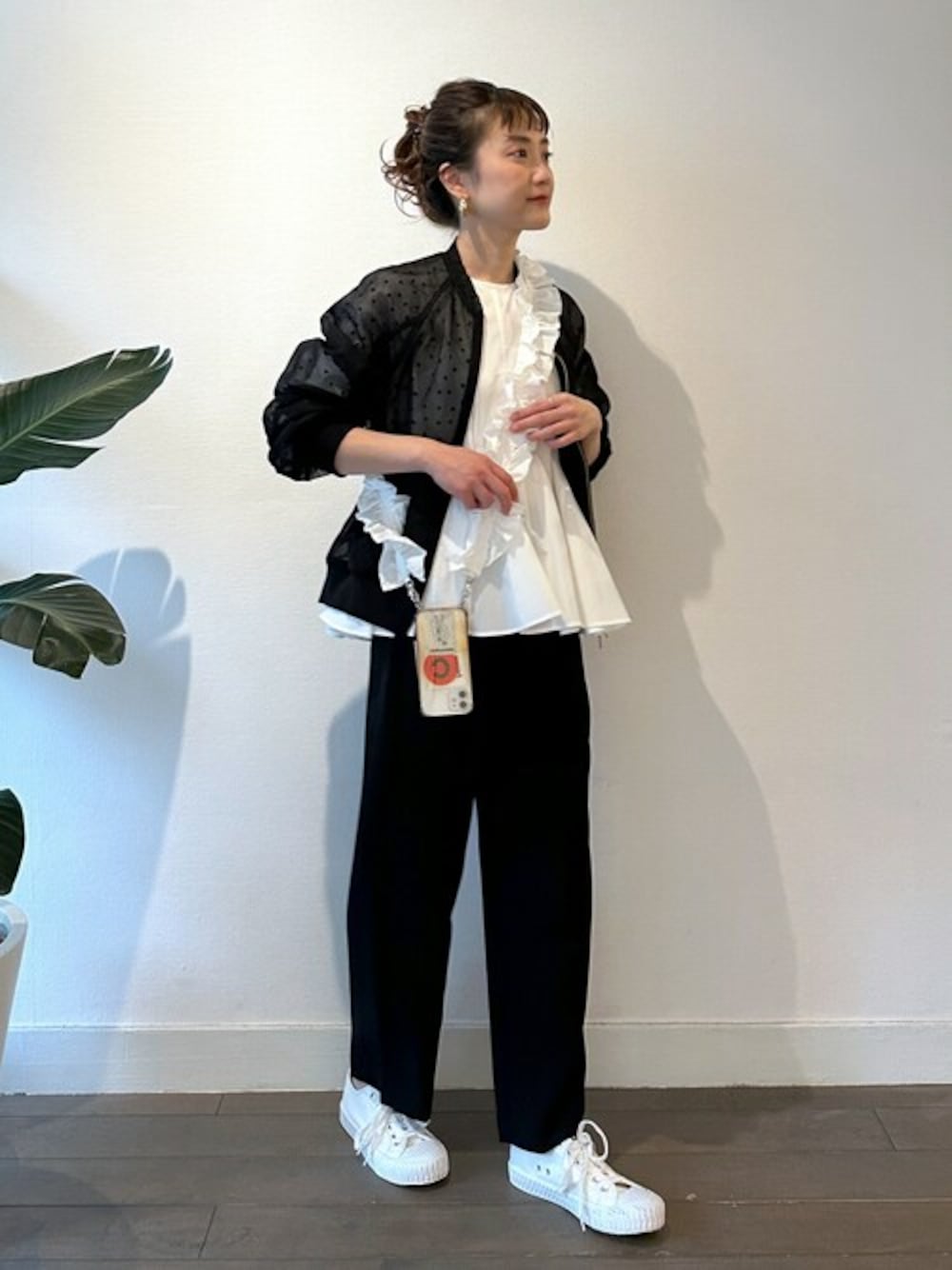 ●ブルゾン シアー素材でこれから春に向けて重宝するトレンド感あるブルゾンです。 ハート柄のフロッキー加工が散りばめられていて、女性らしさもあるデザインになっています。 合わせ方でカッコ良いスタイルにも可愛めのスタイルにも◎◎◎ ●ブラウス ふりふりひらひらの立体シルエットで春らしく軽やかなスタイルが叶います。 ブラック×スニーカーで甘すぎないスタイルにしてみました。 ●パンツ 万能過ぎてフル活用のパンツ! 今回はスニーカーでカジュアルダウンスタイルに♪ ●スマホショルダー ふりふりと存在感があって、シンプルコーデのアクセントになってくれます。 存在感がありながらも合わせやすくてコーデを選ばずに使えるのも嬉しいポイントです♡