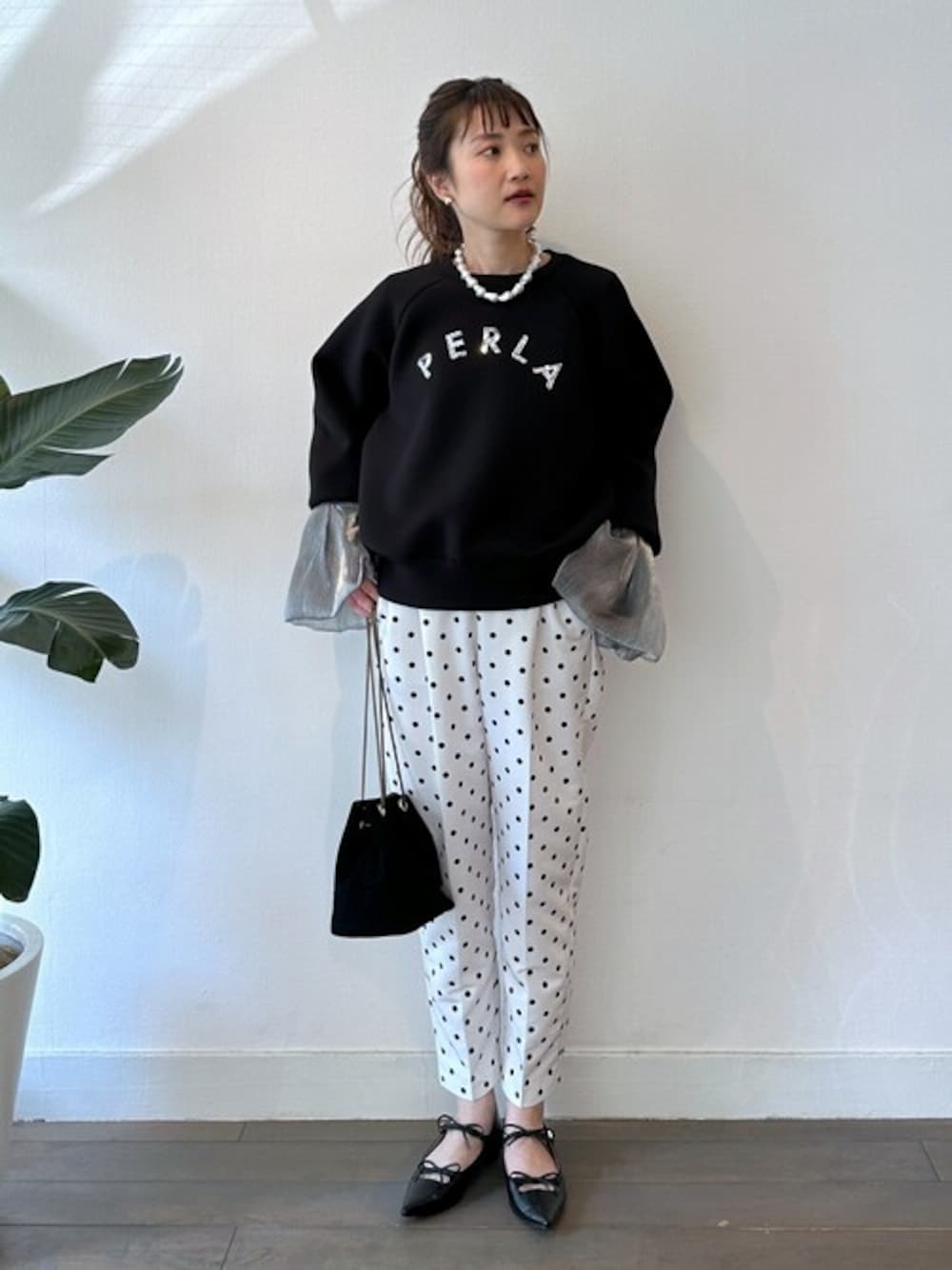●プルオーバー もっちり弾力感のあるプルオーバーで着ていて気持ちがいいです♪ フロントロのスパンコールが丁度いいアクセントなってくれて、 光の当たり具合でキラキラと光る感じも素敵な一着です。 ゆったりめの作りなので、今回はインナーに袖デザインのカットソーを合わせてみました。 ●カットソー 本体はジャージー生地でさらっとした肌触りなので、これからの季節にぴったりです。 存在感たっぷりの袖口は光沢感のある異素材生地になっていて、普段使いのアクセントとしてだけじゃなく、 お呼ばれコーデにも重宝しそうです。 ●パンツ オフホワイトのフロッキードットパンツは、爽やか&春めいた印象で、 シンプルに合わせても華やかになるので春夏大活躍してくれそうです♡