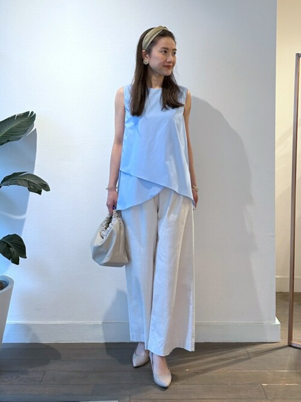 ●ブラウス 緩やかに広がったノースリーブブラウスで、 さり気なくウエスト周りをカバーしてくれます。 フロントのクロスに重なったデザインが◎◎◎ すっきりノーカラーで洗練された印象に見せてくれます。 サックスブルーは涼し気で爽やかスタイルにピッタリです! ●パンツ ストレッチ&ワイドの楽チンパンツは、 ナチュラルな風合いが魅力で、リラックス感のあるコーデ以外にも、 ヒール合わせのキレイめカジュアルにも◎◎◎ シンプルだからこそ、アイテム次第で色んなスタイルが楽しめます。