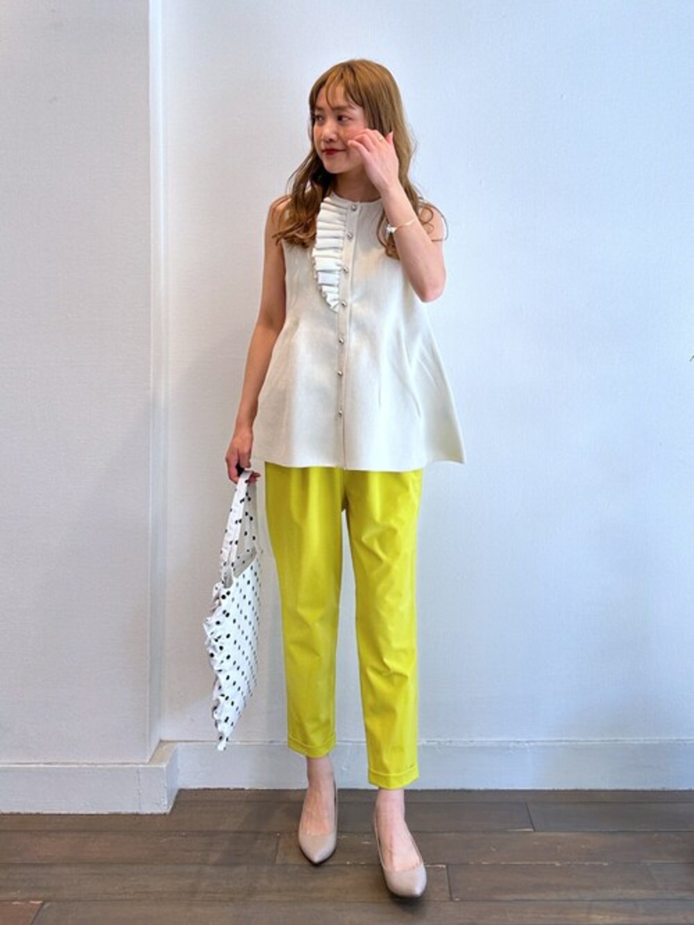 ●ニットジレ フロントのフリルやシルバーボタンがポイントのニットジレは、 モチモチとした弾力感が気持ちが良く、軽量で着やすい一枚です。 チュールトップス等の薄手のインナー合わせもいいですが、今の時期には 一枚でノースリーブで着ても可愛いです♡ ペプラムシルエットで女性らしさを出しながら、ウエスト周りもちゃんとカバーしてくれます♪ ●パンツ さらりとした肌触り+ストレッチ性があり快適な履き心地のパンツです。 夏らしい鮮やかイエローは、コーデのアクセントにもぴったり◎◎◎ テーパードシルエットなので、カジュアルスタイルもラフになりすぎず綺麗に見せてくれます。