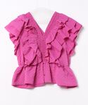 ●ブラウス 存在感たっぷりのラッフルフリルが可愛いブラウスです! ふわっとひらっとしたシルエットで一枚でレディなスタイルが叶います♪ 肩先もフリルで隠れるので、二の腕の華奢見え効果にも◎◎◎ シアサッカー素材でさらっとした夏らしい爽やかな着心地も嬉しいポイント!!! 今回はデニムでフェミカジュスタイルに♪ ドットパンツや、テーパード、Iラインスカート合わせでキレイめ、フェミニンにもぴったり♪♪