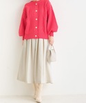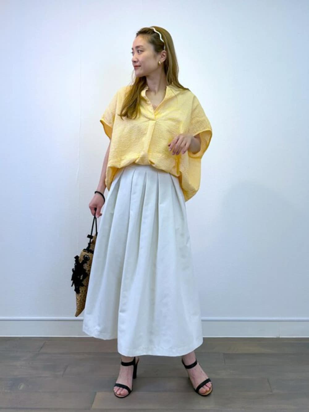 ●ブラウス 生地の表面がポコポコと細かな凹凸があるシアサッカー生地のブラウスで、 さらっとしているので夏に最適な一枚です。 ゆったりとしたサイズにスキッパーデザインが涼し気でノンストレスな着心地です♪ コクーンの様に丸みのあるシルエットが可愛く、細めのストライプだから大人スタイルにも取り入れやすいです。 ●スカート 着回し抜群のタックスカートです。 単色でシンプルなデザインなので、色柄物やデザイン物との相性も◎で、 テイストもカジュアルからキレイめ、フェミニンと幅広く使える優秀アイテムです。 大きめのタックによってふんわり感が増し、体型カバーにもなってくれます。