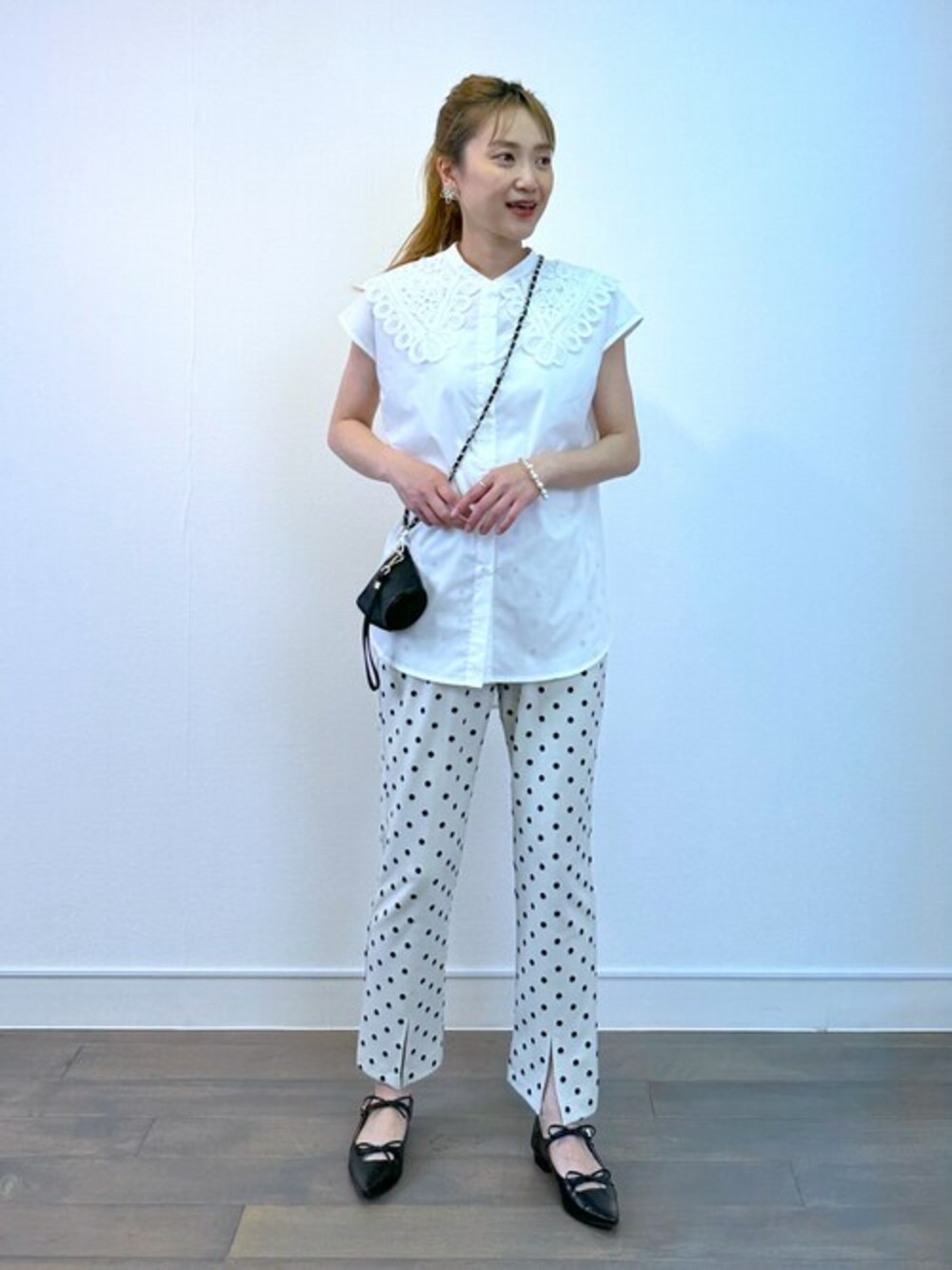 ●ブラウス デイリーだけじゃなく、きちんと感もあるのでオンオフで使えるブラウスです。 付け襟風のレースカラーがアクセサリーなしでも顔まわりを華やかに見せてくれます♪ 前後差のある丈でお尻も隠れるので、アウトスタイルでさらっと着ても様になるのもポイント! ●パンツ 柔らかくてストレッチ抜群のパンツです。 コーデのアクセントにぴったりなドット柄は、 一枚取り入れるだけで華やか可愛さを演出してくれます♪ キレイめ、フェミニンはもちろんカジュアルダウンスタイルにも活躍します。