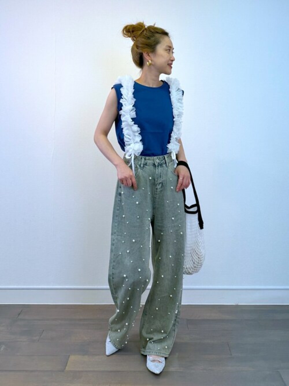 ●ノースリーブ フル活用中のコットン100%のノースリーブ!! 今回はブルーを着てみました♪ ブルーで夏らしさがありながらも落ち着いた感じの色味なので、 コーデにも取り入れやすいです。 ●デニム パール×ゆったりシルエットのトレンド感のあるデニムです。 カジュアルやボーイズライクな印象になりやすいデニムも パールが付いてる事で大人可愛く着れます♪ フリルやレースアイテムでとことん甘めスタイルを楽しむのも シンプル、ハンサムなアイテム合わせで甘辛な合わせを楽しむのも◎◎◎ ●サスペンダー コーデが一気に着映えるサスペンダーです♪♪ アクセアリー感覚で使えるマストアイテムです♡ 紐の絞り具合で長さ調節が可能で、絞るとよりギャザー+立体感が出て可愛いです。
