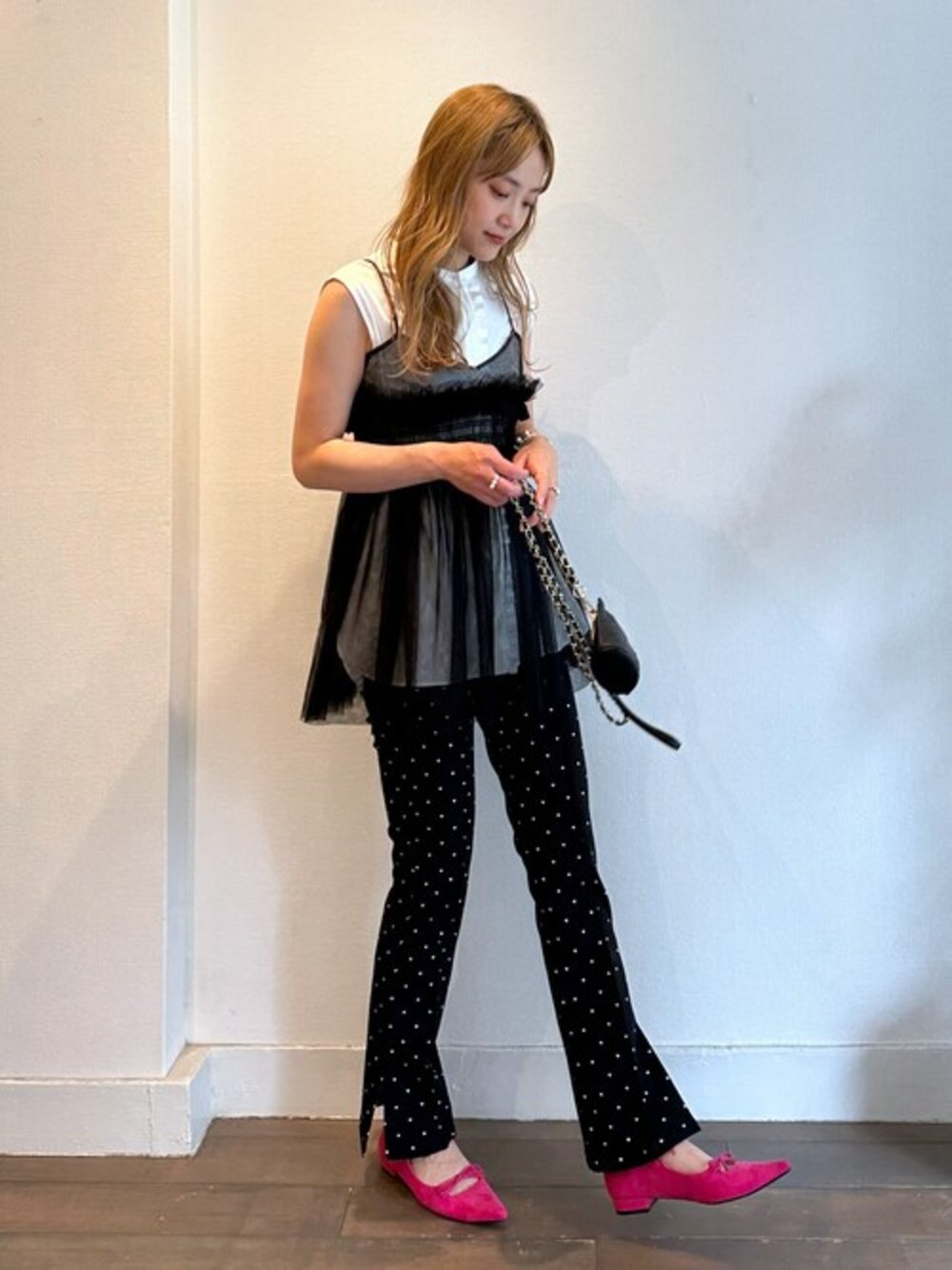●キャミソール 一枚取り入れるだけでコーデが着映える万能なチュールキャミソールです♪ ほんのり長めの着丈でウエストやヒップをカバーしてくれます! 可愛くてトレンド感もあり、細身パンツやワイドパンツ、タイトスカートなど ボトムや小物で色んな雰囲気が楽しめます♪ ●ブラウス オンオフで使えるノースリブラウスです!! 前立て部分のサテンフリルがさり気なく良いアクセントになってくれます♪ シルエットはシンプルベーシックなので幅広いボトムとも好相性です! テーパードやスラックスでハンサム、フレアスカートで上品な感じ、デニムでカジュアルダウンにも◎◎◎ ジャケット合わせできちんと感のあるスタイルにも活躍してくれそうです。 ●パンツ 可愛さと履き心地の良さを兼ね備えたパンツです!!! ストレッチ抜群!!!!!動きやすくノンストレスな履き心地です!! 動きやすさがありながらも、しっかり質感の生地なので綺麗見えしてくれます♡ センターシームやサイドスリット入りですっきり見えするのも◎◎◎ 小さなハート柄がキュートで大人可愛いコーデに最適です♪