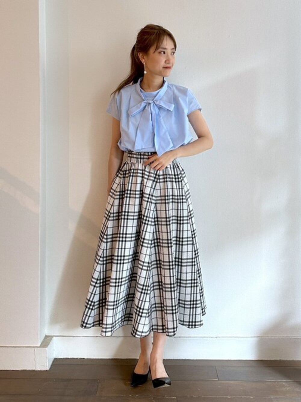●ブラウス さらっとした肌触りにハリのある生地感で、オンオフで活躍できるブラウスです。 長めの着丈なのでパンツ合わせのアウトスタイルも様になります。 上品で清楚な印象に見せてくれ、王道フェミニン、品格レディスタイルにもぴったりです。 ●スカート ポコポコと凹凸のあるサッカー素材で、涼し気な着こなしが叶います。 カジュアルな印象になりやすいチェック柄も、 ふんわりと広がるシルエットによって女性らしく、上品見えしてくれます。 幅広めのウエストで脚長効果も期待出来ます♪