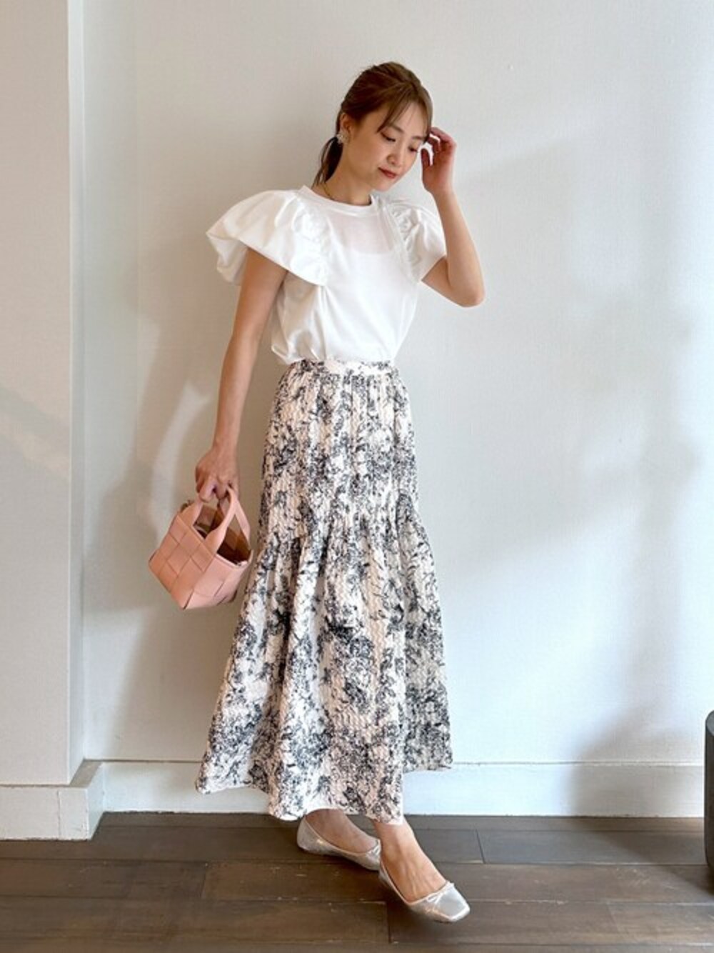 ●プルオーバー ふわっとボリューミーな袖が可愛いプルオーバーです♪ 袖はハリのある生地感で立体的なフォルムに◎◎ 身頃はラメ入りなのでベーシックカラーながらも華やかな印象に見せてくれます! 薄手なので今の時期に丁度良く着れます◎ ●スカート 涼し気で品よく履けるスカートです! ぽこぽこと凹凸のある膨れジャガードに切り替えギャザーで 女性らしい動きのあるシルエットが楽しめます。 落ち着いた印象のフラワー柄で大人コーデにも取り入れやすいです♪