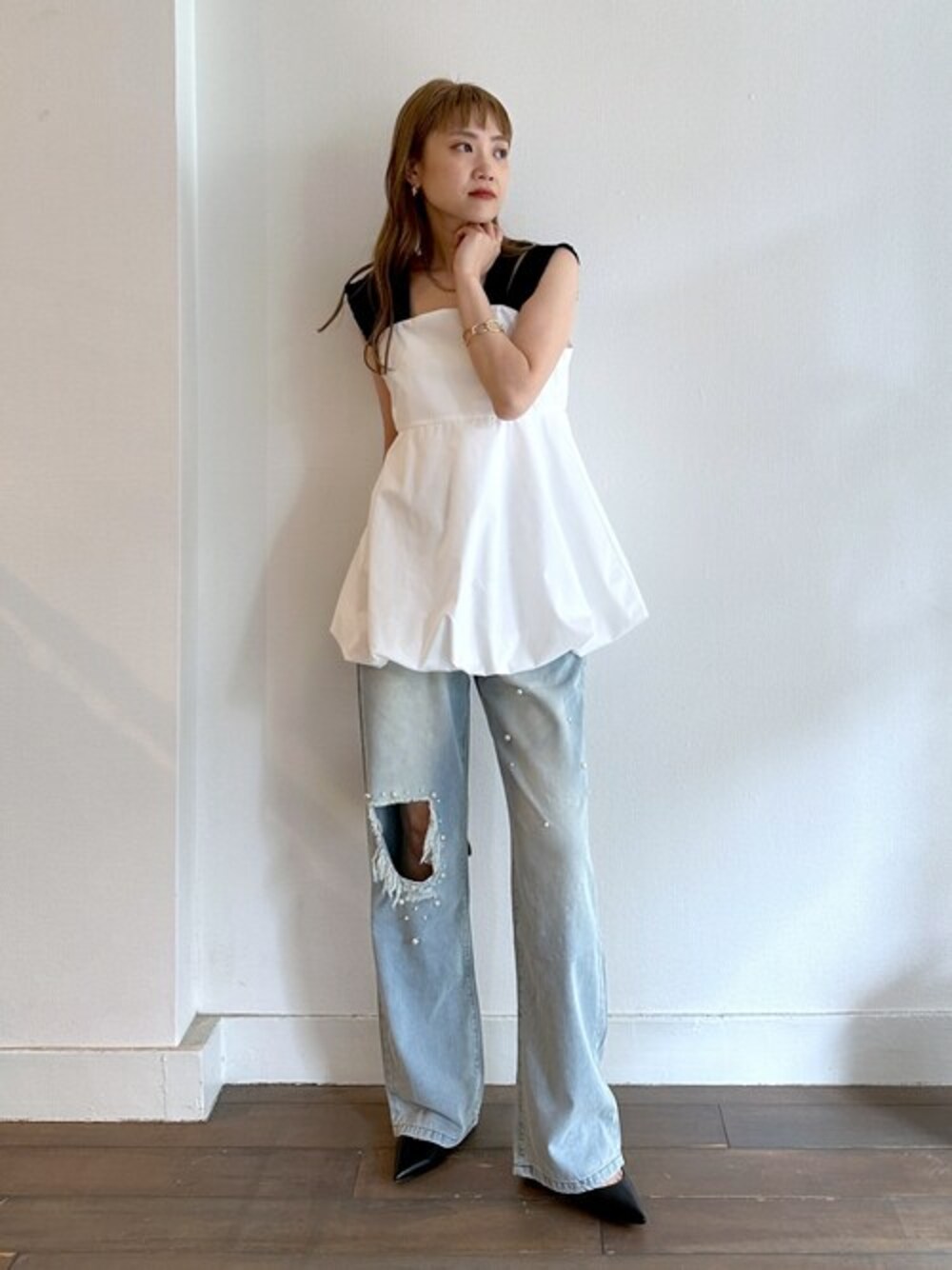 ●ブラウス 今季一枚は持っておきたいバルーンアイテム!!!! 切り替えからのふんわりシルエットが何とも可愛い一枚です♡ 太めのダブルストラップにはフリルがプラスされていて、 細部まで抜かりないデザインが◎◎◎ 夏は一枚で涼し気に着たり、ノースリやTシャツ、シアートップス合わせも可愛いです。 秋冬には袖デザインブラウスやタートルニットと合わせて着たいです♡ ●デニム 一本でトレンドスタイルが叶うダメージデニムです! フロントにはパールも散りばめられているので、 レディスタイルにも取り入れやすいです♡ Lサイズを着用しています。ウエストは結構緩めなので、 ベルトなしだとMサイズがいいと思いました。
