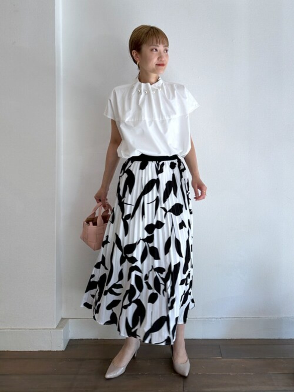 ●ブラウス 襟のビッグパールがポイントのブラウスです。 ハリのある素材で立体感があり、上品で顔まわりも華やかになります。 前後差のある着丈なのでアウトスタイルでさらっと着てもカッコいいです♪ きちんと見えもするので、普段使いだけじゃなく、 オフィスやお呼ばれコーデにも活躍してくれる一枚です!! ●スカート ボタニカル柄がコーデのアクセントにぴったりなスカートです。 柔らかく軽やかな質感で、歩くたびにひらっと揺れる感じも素敵です♡ モノトーンで落ち着いた印象なので、品よく着れます。 キレイめやオフィスカジュアルにも◎◎◎