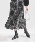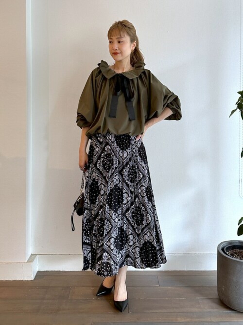 ●ブラウス ボリューミーなシルエットが魅力のブラウスです♪ 存在感たっぷりな襟はリボンの締め方で色んなシルエットが楽しめます。 ゆったりとしたシルエットですが、裾や袖口にゴムが入っているので、 キュッとプッシュアップしたりとメリハリのある着こなしも♡ 落ち着いたカーキは大人な印象でこれからの季節に大活躍してくれそうです♡ ●スカート ペイズリー柄のスカートは、プリーツ加工が施されているので、 ヒラっと揺れる感じも綺麗です。 柄もモノトーンなので、コーデに合わせやすく、大人も手に取りやすいです! ウエストが総ゴムなのも何気に嬉しいポイントです♪