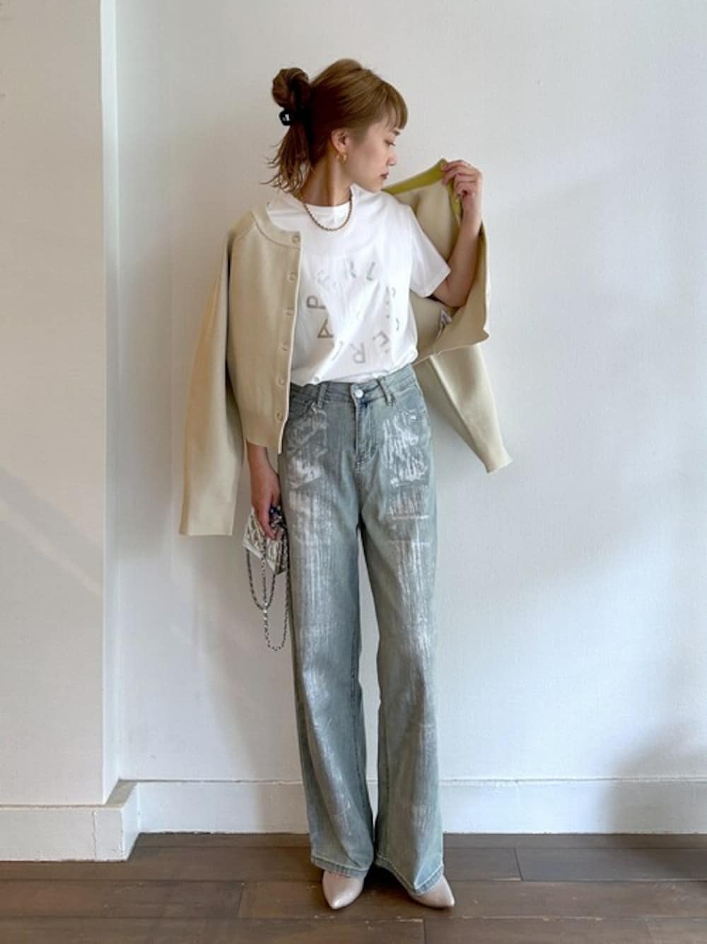 ●カーディガン これからの時期に活躍するカーディガンです! 襟ぐりや前立ての内側は配色カラーになっていて、 開けてきた時にチラリと見える感じも可愛いです♡ ゆったりとしたシルエットにコンパクトな着丈で 幅広いボトムとも好相性なのでコーデに取り入れやすいです♪ ●Tシャツ フロントのサークルロゴプリントがポイントになるTシャツです。 シルバーのプリントは派手過ぎないので、カラー物や柄物のボトムとも合わせやすく大活躍! ●デニム フロントの箔プリントが大人かっこいいデニムです! ヴィンテージのようなこなれ感のある風合いがお気に入りです♡ すっきりとしたシルエットで綺麗に見せてくれます。 今回はLサイズを着用してみました。ウエストは大きすぎる感じもなく、丁度良く履けました。
