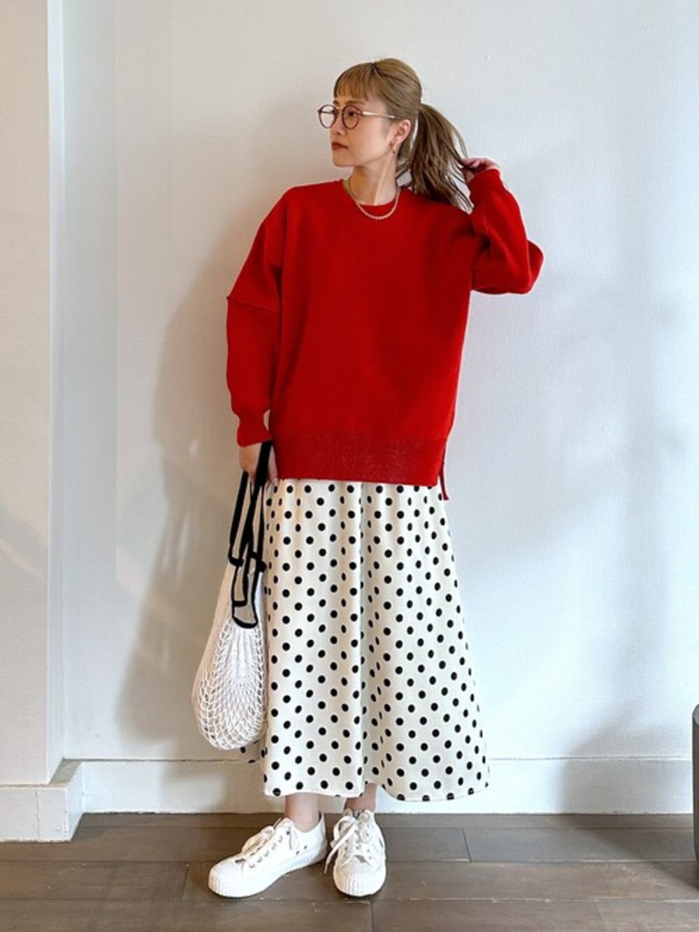 ●ニット 気分はすっかり秋気分です♪ トレンド感ある絶妙なゆったりシルエットがお気に入りで、 さらっと着るだけも今年っぽいスタイリングが完成します。 落ち着き感のあるレッドカラーが何とも可愛く、 コーデのアクセントにもぴったりの一枚です。 冬にはインナーに襟ブラウスやタートルを入れてレイヤードするのも良さそうです♪ ●スカート ドット柄が目を惹く大人可愛いスカートです。 サテンの光沢感があるので、上品コーデにも活躍します! 緩やかなフレアラインで広がりすぎないのもポイント!