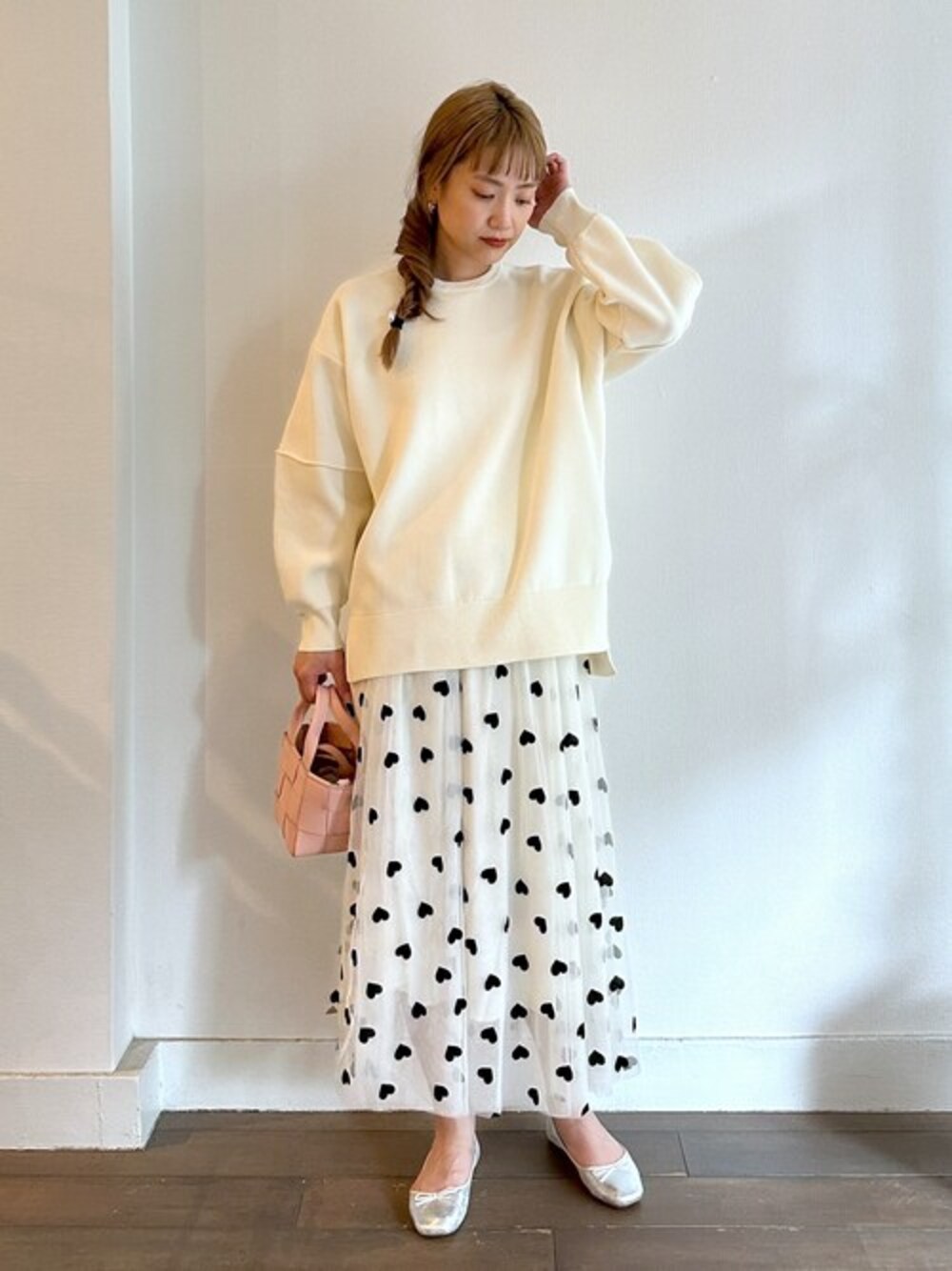 ●プルオーバー シンプルながらもトレンドスタイルが叶うプルオーバーです。 ほんのりと丸みのある袖が可愛く、ゆったりシルエットでヌケ感を出してくれます♡ シンプルがゆえにコーデにも取り入れやすく、着回し力抜群な万能プルオーバー! 今回はチュールスカート合わせで甘め+ラフ感のあるフェミカジュスタイルに♪ ●スカート コーデのアクセントに大活躍なスカートは、柔らかなチュールにフロッキーのハート柄で、 可愛らしさとエアリーな雰囲気のある一枚です。 裾の薄っすらと透ける感じや歩くたびにひら~と揺れる感じが何とも可愛いです。