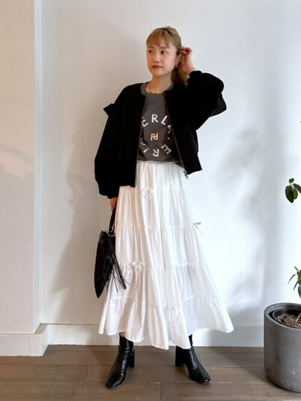 ●ブルゾン 袖のふんわりボリューミーなシルエットが可愛いブルゾンです。 ゆとりのあるサイズ感ともっちり弾力のある素材で、着心地、肌触りのいい一着です。 袖にはフリルがプラスされていて、カジュアルながらも可愛さやアクセントのあるデザインが◎◎◎ ボリュームはありますが、身頃はシンプルでノーカラー+ショート丈なので、 野暮ったくならずにコーデのバランスが取りやすいのもポイントです。 ●Tシャツ フロントの箔プリントがアクセントになるTシャツは、 ベーシックなシルエットで使い勝手のいい一枚です。 落ち着きのあるチャコールグレーは、シックで洒落感のある雰囲気を出してくれるので、 大人のカジュアルスタイルを引き立ててくれます。 気温差のある今の時期にもまだまだ活躍してくれます。 ●スカート ひら~と揺れるシルエットが何とも可愛いティアードスカートです。 フロントにはリボンは散りばめられていて、華やかさ+可愛さ溢れる一枚です。 爽やかなオフホワイトは、暗くなりやすい秋冬コーデに軽さを出してくれそうです。