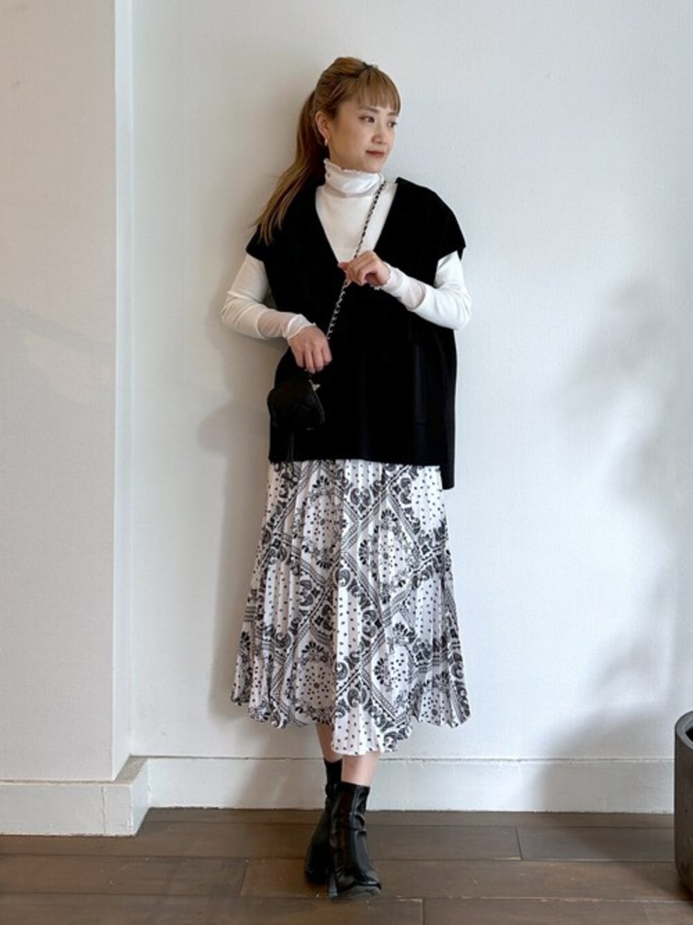 ●ベスト 季節の変わり目に活躍してくれるニットベストは、 無地&シンプルなデザインなので、インナー、ボトムを選ばずに使えます! 襟、袖にデザインがある物にも、パンツ、スカート、ワンピース等と 色んな雰囲気のレイヤードスタイルが楽しめます。 ●プルオーバー 袖やタートル部分にチュールが使用されたトップスは、 トレンド感がありながら、マルチに活躍してくれる万能な一枚です。 シルエットはベーシックなので、コーデにも取り入れやすく、 一枚での着用以外にもジレ、ジャケット、サロペット、ジャンスカ等のインナーにも重宝し、 寒い日には、ゆったりめのニットやスウェットの下に着たりと色んな着こなしが可能です。 ●スカート 上品な印象に見せてくれるペイズリースカートです。 コーデの主役にもピッタリな柄で、シンプル合わせでも着映える一枚です。 モノトーン配色なので、派手になりすぎる事なく着用頂けます。