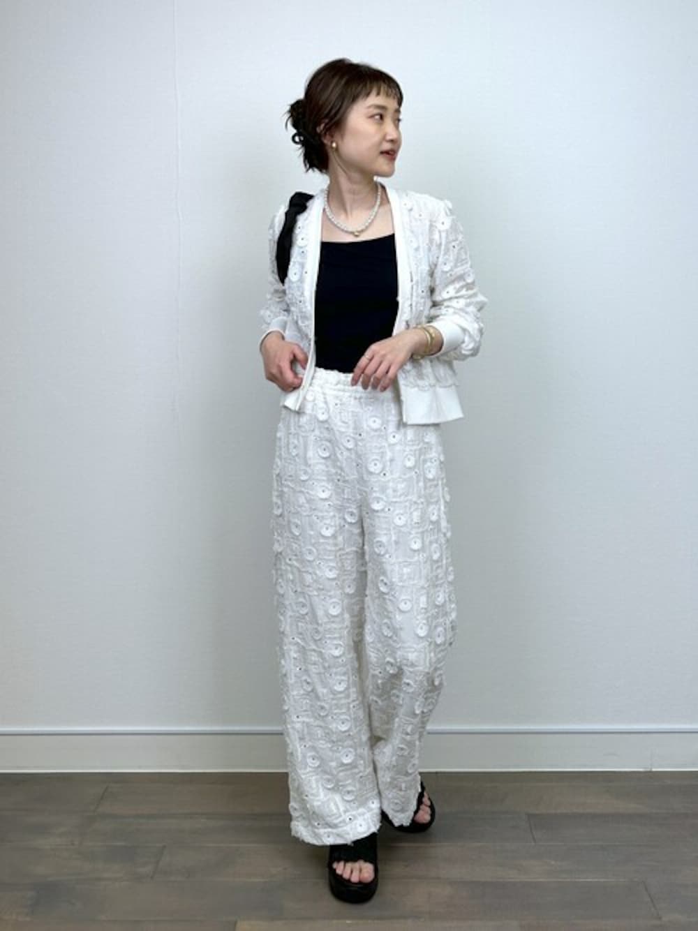 ●カーディガン ナチュラルさと可愛さのあるレースカーディガン。 ありそうでない新感覚のレース柄がお気に入り♪ 新鮮な柄で羽織るだけでワンランク上のおしゃれが楽しめそうです。 後ろに入ったギャザーによって立体感がプラスされ、バックスタイルも抜かりない! 短すぎず長すぎずの絶妙な丈感で、パンツ、スカートとボトムを選ばずに使えて、 フェミニンにもナチュラルにもフレンチカジュアル等、合わせ方次第で色んな雰囲気で楽しめそう♪ ●パンツ カーディガンと同素材のイージーパンツは、コーデのアクセントにぴったりの一本!! ウエストは総ゴム+内紐付きで楽々◎◎ タンクトップやノースリに薄手のオーバーシャツ合わせでリラックス感のあるスタイルや プリントTにメッシュジャケット等でちょっぴりハンサムなスタイル等、 一癖あるカジュアルスタイルが楽しめそうです。 ゆったりシルエットのビッグT合わせであえて、ラフでルーズなこなれスタイルにも良さそう♪ ●サンダル スニーカー風のソールが今年らしくてお気に入りです♪ 深めの甲ベルトにかかとはゴムなのでフィット感もあり、歩きやすいです。 厚めのソールでスタイルアップにもなり、足元にボリュームが欲しい時にも大活躍!!