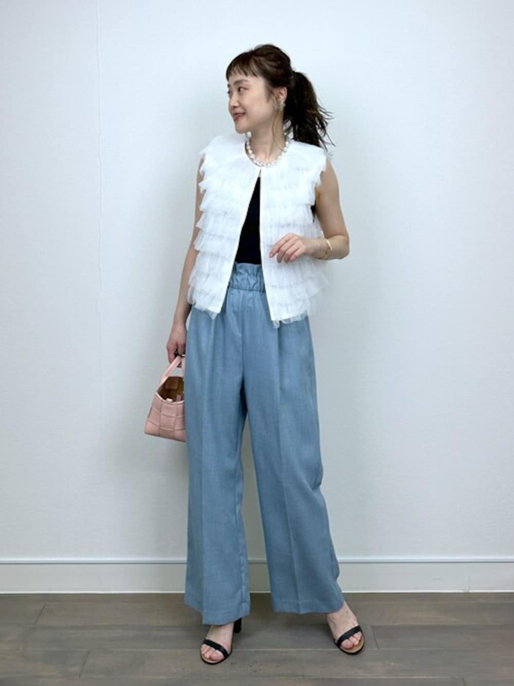 ●ベスト たっぷりなティアードデザインが可愛いベスト♡ 全体にチュールのティアードが施されていて、ふわっとひらっとしたデザインが◎ ボリューム感がありつつ、コンパクトな丈感なのでコーデのバランスも取りやすいです。 その時々で着こなしが楽しめる前後2WAYなのも嬉しい♪ これからの時期はタンクトップやノースリ合わせですっきりと涼し気に。 秋口には、シアートップス等を入れた着こなしも良さそう。 ワンピースやサロペットと合わせたり、マンネリしたいつものコーデに一枚取り入れるだけで、 また新鮮なスタイリングが楽しめそうです♪ 合わせ方次第ではオケージョンやお呼ばれコーデにも活躍してくれそう♡ ●パンツ ハイウエストとストンとしたラインで美シルエットな一本。 ウエストは総ゴム仕様で履き心地も楽々。 今回は付属のリボンベルトは付けずにすっきりと着用。 ベルトなしでもウエストのフリルが活きていいアクセントになってくれます。