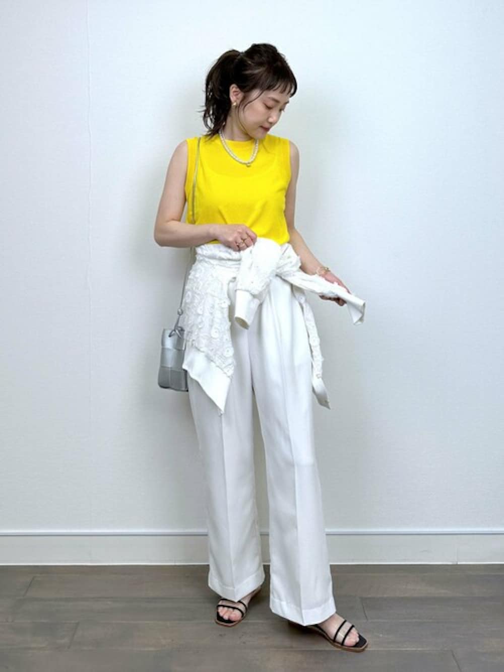 ●ノースリーブニット この夏活躍間違いなしの接触冷感アイテム!!!! 首元がキュッと詰まったデザインできちんと感もあるので、大人スタイルにもピッタリ。 鮮やかなイエローは着るだけで気分も上がり、夏コーデのアクセントにも最適です! メイントップスとしてもキャミワンピースやサロペットのインナーにも重宝しそう。 ●カーディガン ナチュラル感のあるレースカーディガンはカジュアルコーデに大活躍。 ありそうでないレース柄がお気に入りで、シンプルな合わせに一枚取り入れると、グッと洒落感を出してくれます。 片掛け、斜め掛け等とそれだけでもコーデのアクセントになってくれます。 今回は、今年っぽく腰巻きスタイルで♪ ●パンツ スタイルアップが期待できるハイウエストパンツは、太すぎず細すぎずのシルエットで、 コーデのバランスも取りやすくマルチに活躍してくれます。 ウエストゴムで楽な上に、ウエストのひらひらとしたフリルが丁度良いアクセントに◎◎◎ 付属のリボンベルトを使えば、華やかさが増し、また違った印象が楽しめます。