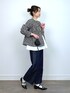 ●ブルゾン コーデの主役になるフロッキーハートのブルゾン♡ 今回はデニム合わせでカジュアルに着用。 切り替えからひらっと広がったシルエットなので、 パンツ合わせでも女性らしい印象に仕上がります。 ●ニット 一枚は持っておきたいペプラムニットです。 上身頃や袖はスッキリ+切り替えからのふわっと立体的なシルエットが女性心くすぐります♡ 可愛いだけじゃなく、ウエストまわりをしっかりカバーしてくれるのも嬉しいポイント! ●パンツ ラメ入りのデニムパンツは、光の当たり具合でキラッと光り、主張し過ぎないくらいのさり気なさが◎◎◎ ワイドシルエットや後ろゴムで動きやすく、ポケットフリル付きで可愛さも抜かりなしです♡ 今回はSサイズ履いてみました。丈は、足元をすっきり見せたい時にはいいかもですが、 やはりウエストは若干きつかったです。