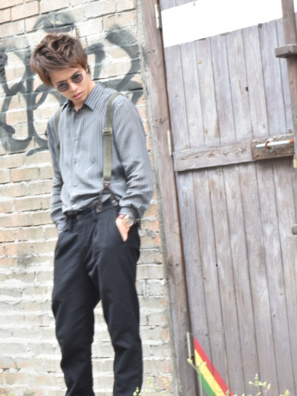 普段から暗めのコーデです。 サスペンダーがお気に入り。