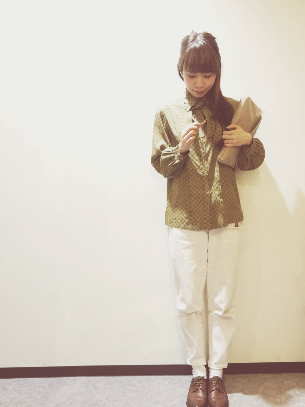 ベージュ系のシャツ/ブラウスを着用したレディースの秋コーディネートの1枚目の写真