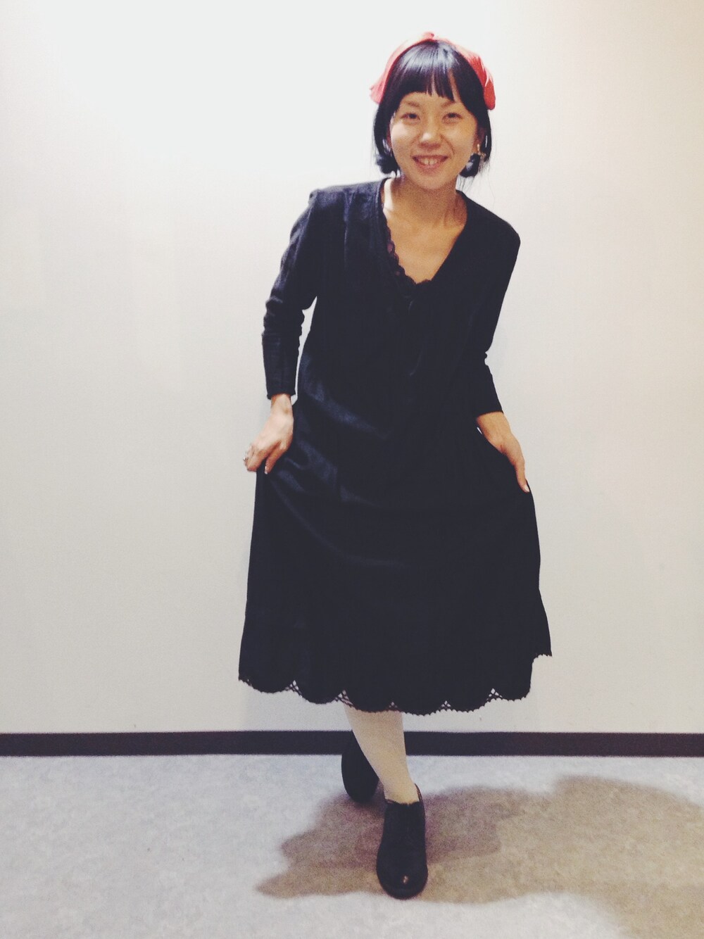 ブラック系のワンピースを着用したレディースの秋コーディネートの1枚目の写真