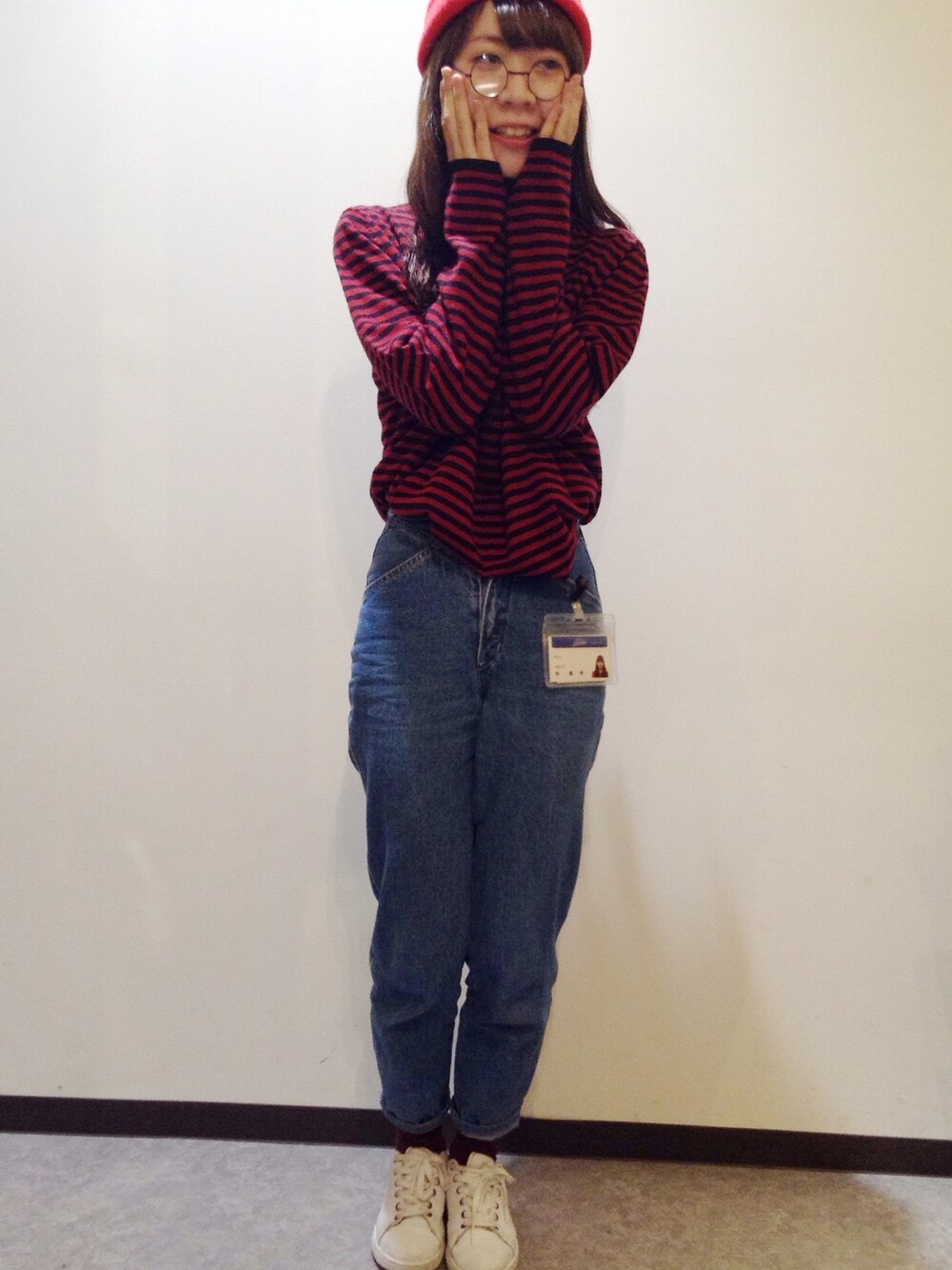 レッド系のTシャツ/カットソーを着用したレディースの秋コーディネートの1枚目の写真